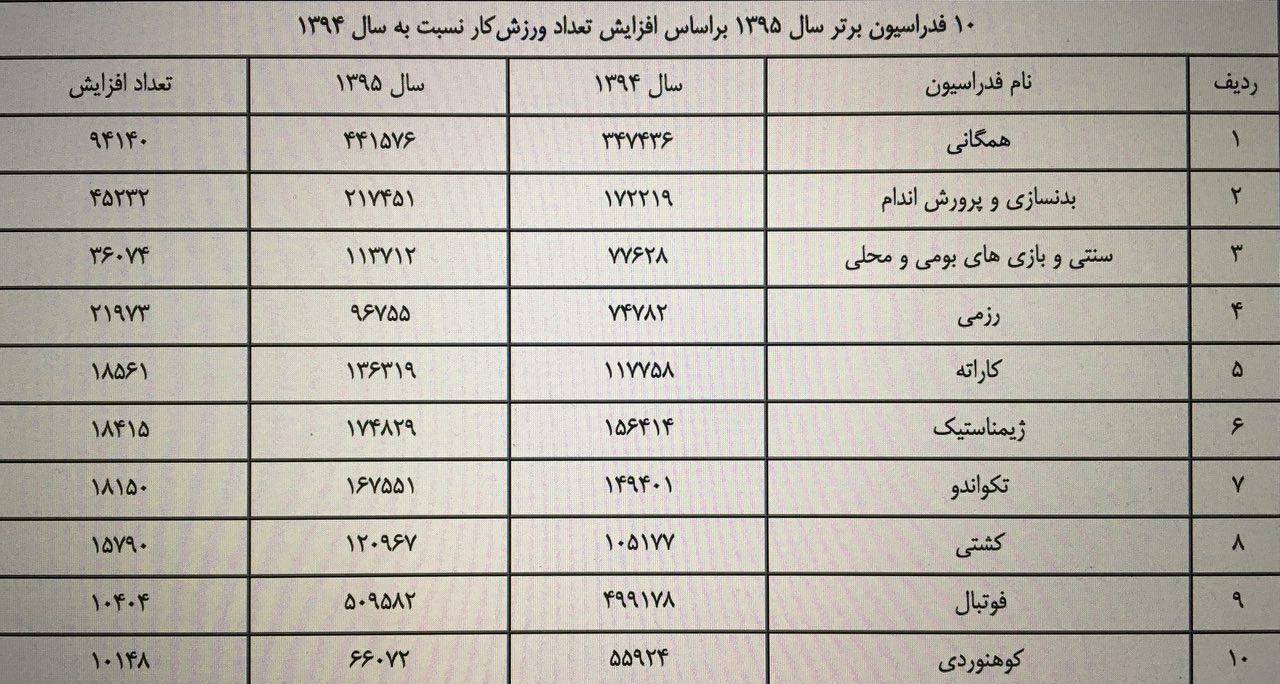 معاون توسعه ورزش همگانی 10 فدراسیون برتر از نظر درصد رشد و افزایش تعداد ورزشکار در سال 95 نسبت به سال 94 را به شرح جدول و تصوير زیر اعلام کرد.