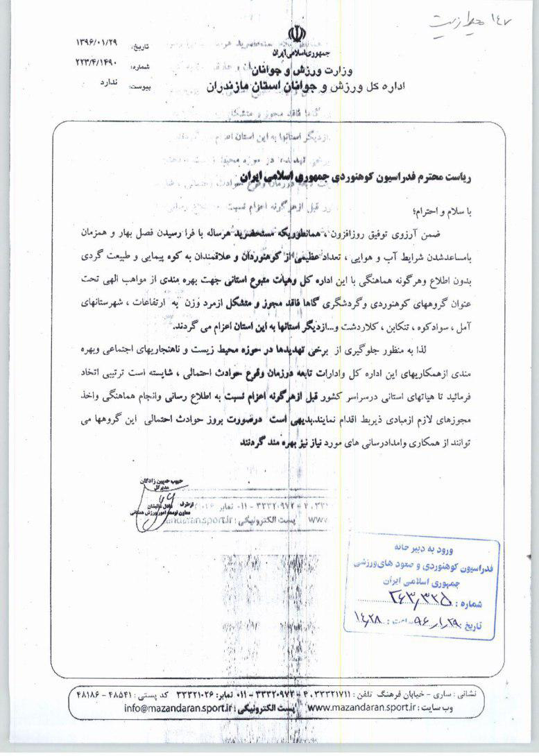 فدراسیون با ارسال نامهای به هیئتهای استانی اعلام کرد: به پیوست متن نامه مدیرکل محترم ورزش و جوانان استان مازندران جهت اخذ مجوز و هماهنگی لازم از سوی باشگاههایی که قصد فعالیت در حوزه گردشگری کوهستان استان مازندران را دارند جهت اطلاع و اعلام به باشگاهها استان ایفاد میگردد.