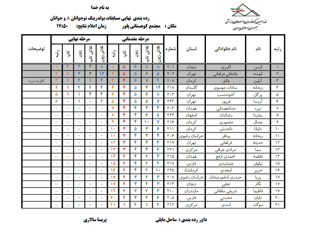 نتایج بیست و یکمین دوره مسابقات سنگنوردی قهرمانی کشور / ماده «بولدرینگ» / رده سنی نوجوانان A و جوانان / دختران / مجتمع کوهستانی پلور: