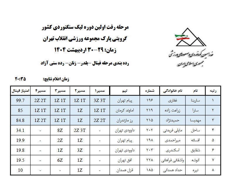 به گزارش روابط عمومی فدراسیون کوهنوردی و صعودهای ورزشی؛ مرحله نهائی در ماده «بلدرینگ» بخش بانوان از رقابتهای دور رفت اولین لیگ سنگنوردی کشور، در «گرویتی پارک» مجموعه ورزشی انقلاب، 29 اردیبهشت ماه 1404 برگزار شد و چهره نفرات برتر مشخص شد.