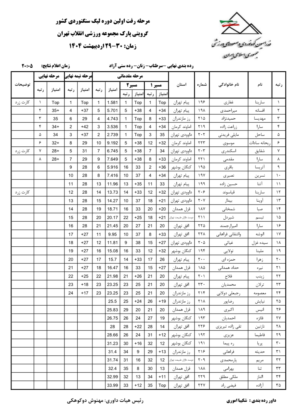 به گزارش روابط عمومی فدراسیون کوهنوردی و صعودهای ورزشی؛ مرحله نهائی در ماده «سرطناب» بخش بانوان از رقابتهای دور رفت اولین لیگ سنگنوردی کشور، در «گرویتی پارک» مجموعه ورزشی انقلاب، ۳۰ اردیبهشت ماه ۱۴۰۴ برگزار شد و چهره نفرات برتر مشخص شد