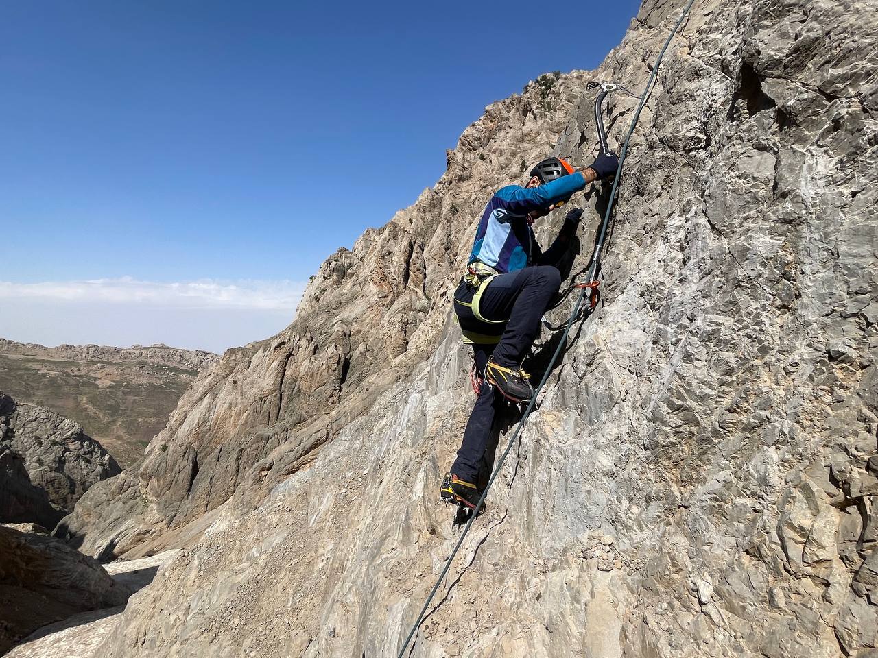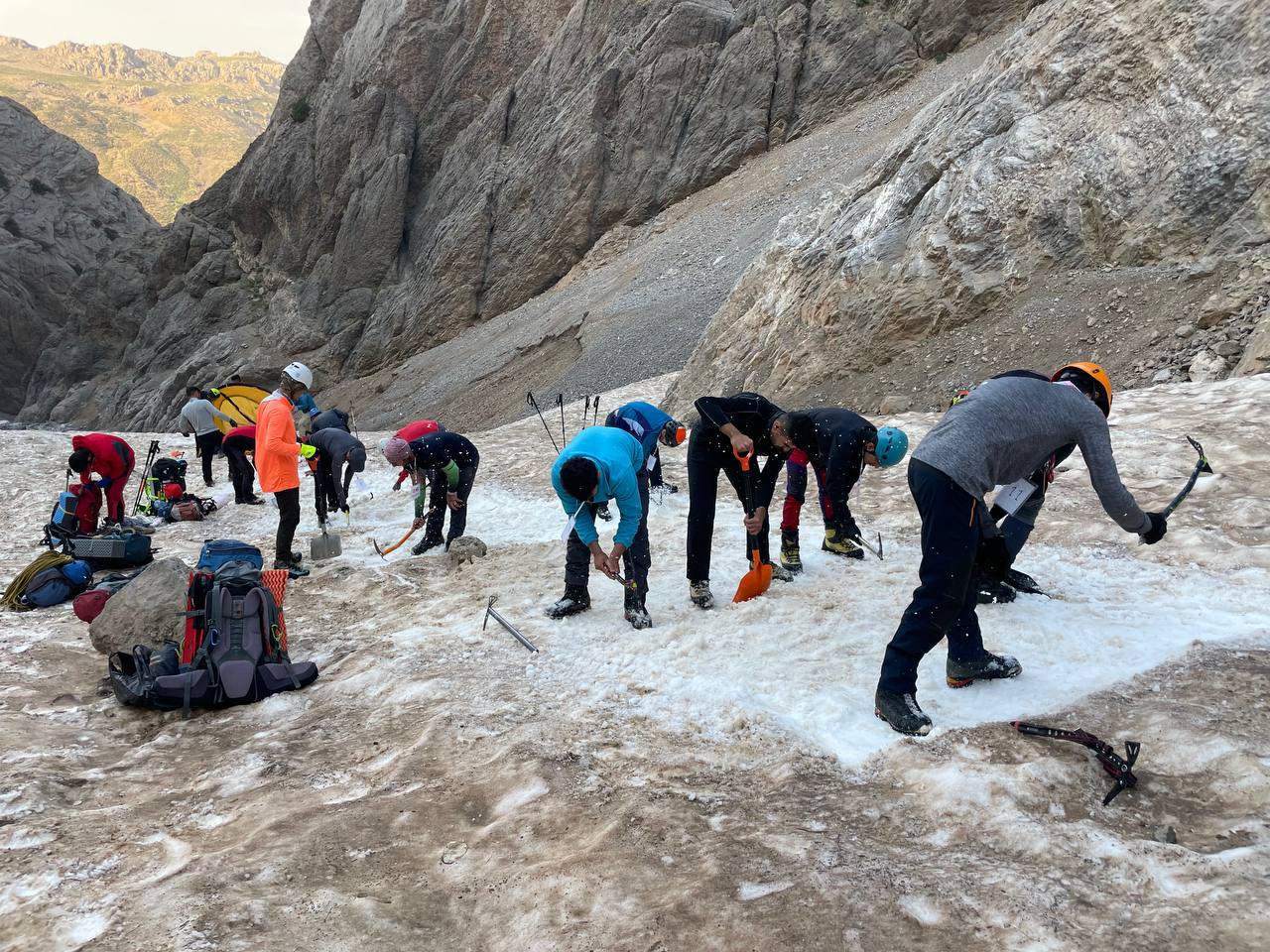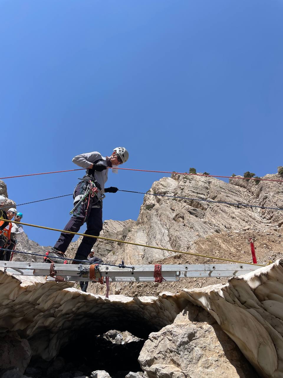 سپس با تجهیزات فنی و کرامپون، در کردههای چهار نفری هم طناب شده و اقدام به صعود شیبهای برفی منطقه کردند.