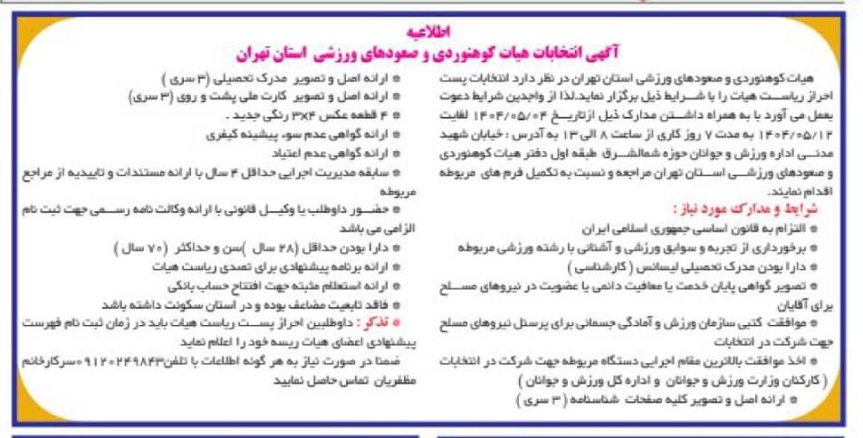 هیئت کوهنوردی و صعودهای ورزشی استان تهران در نظر دارد انتخابات پست ریاست هیات را برگزار نماید. لذا از واجدین شرایط دعوت میشود با ارائه مدارک ذیل از تاریخ ۴ مرداد ۱۴۰۴ لغایت ۱۲ مرداد ۱۴۰۴ روزه (بهجز روزهای تعطیل) از ساعت ۸:۳۰ الی ۱۴:۳۰ به دفتر هیئت کوهنوردی استان تهران واقع در