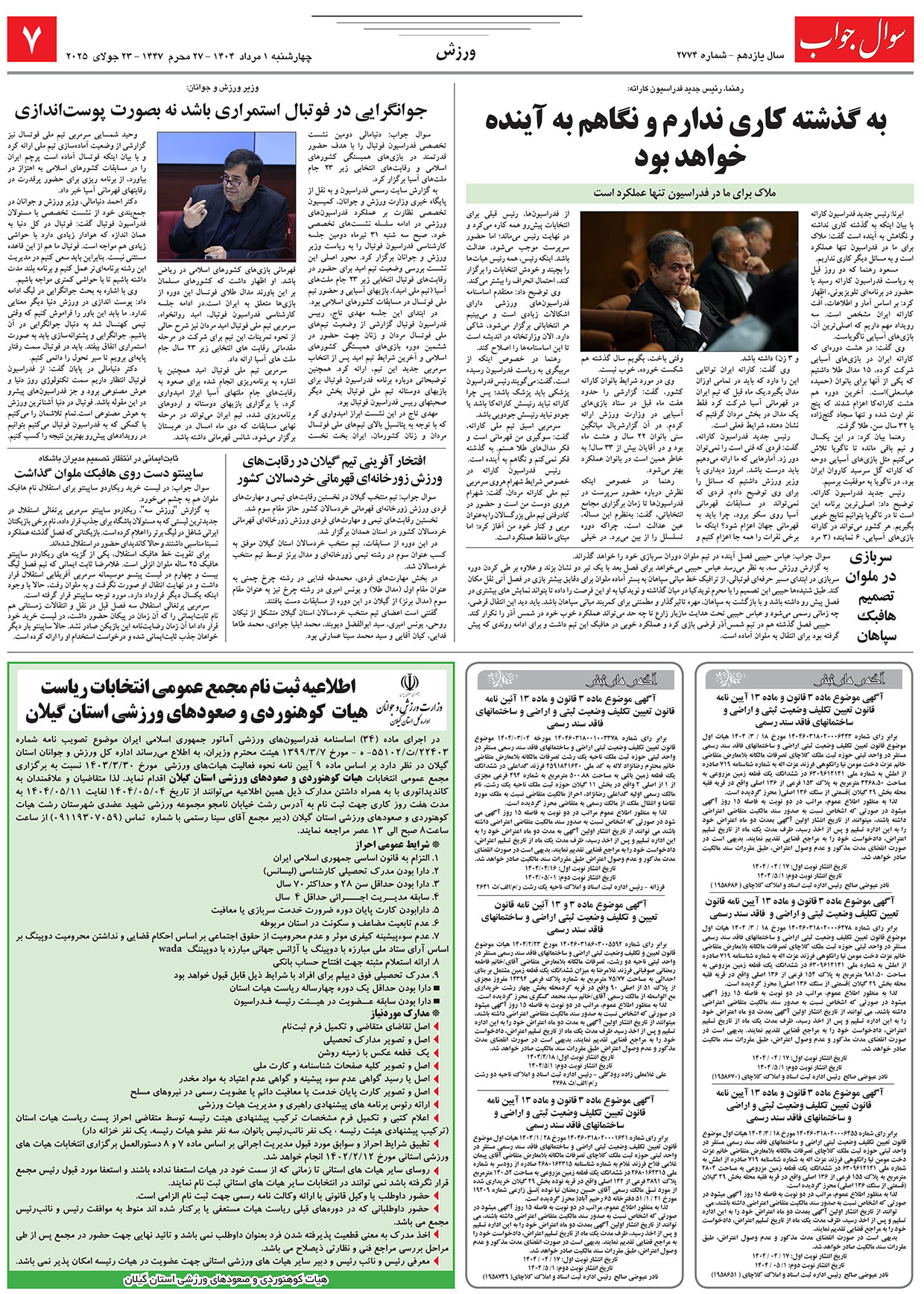 در اجرای ماده (۳۴) اساسنامه فدراسیونهای ورزشی آماتور جمهوری اسلامی ایران ـ موضوع تصویبنامه شماره ۲۲۴۰۳/ت۵۵۱۰۲هـ مورخ هفتم خردادماه ۱۳۹۹ هیئت محترم وزیران ـ به اطلاع میرساند ادارهکل ورزش و جوانان استان گیلان در نظر دارد بر اساس ماده (۹) آییننامه نحوه فعالیت هیئتهای ورزشی مورخ سیام خردادماه ۱۴۰۳، نسبت به برگزاری مجمع عمومی انتخابات هیئت کوهنوردی و صعودهای ورزشی استان گیلان اقدام نماید.