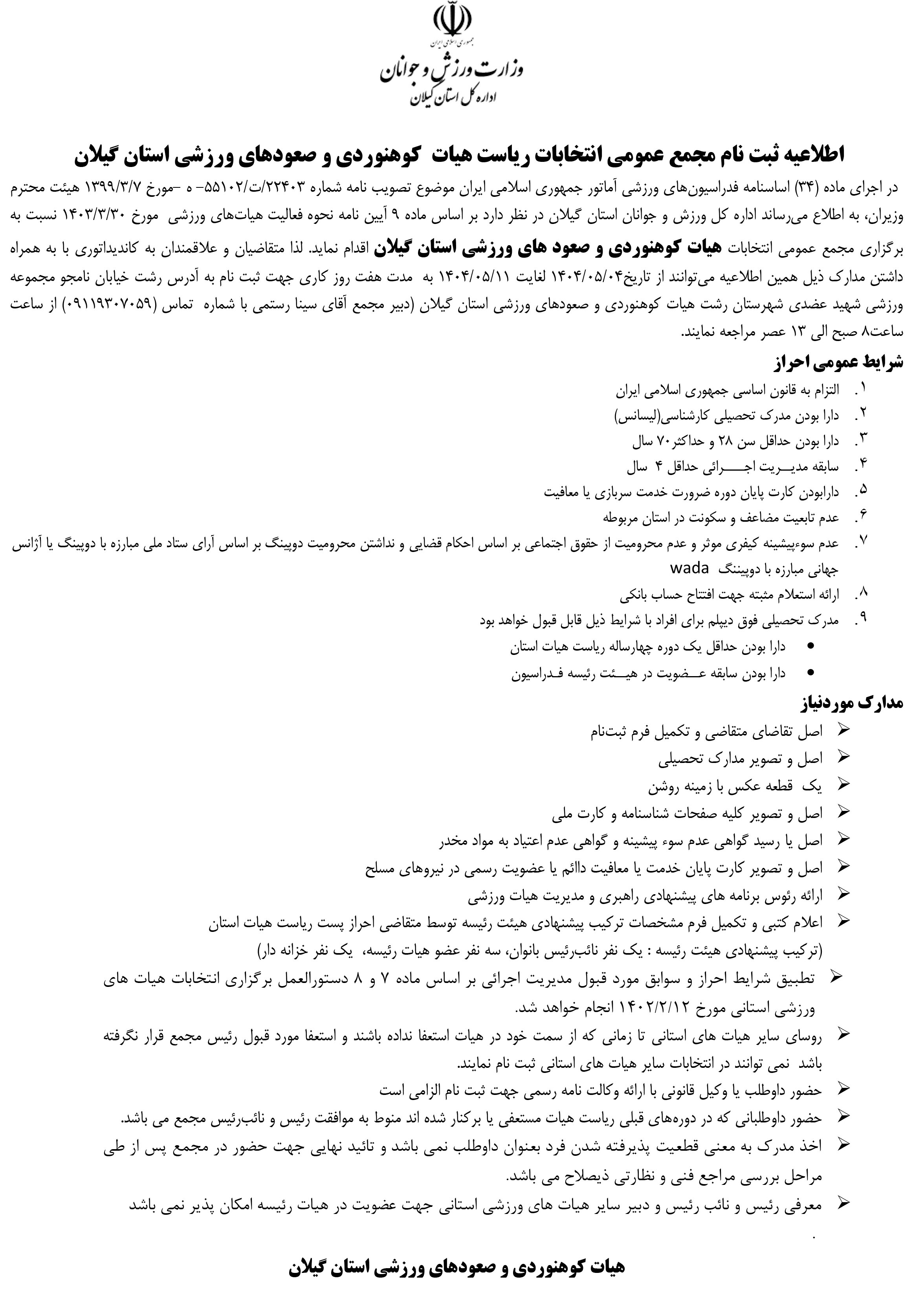 اطلاعیه ثبتنام مجمع عمومی انتخابات ریاست هیئت کوهنوردی و صعودهای ورزشی استان گیلان