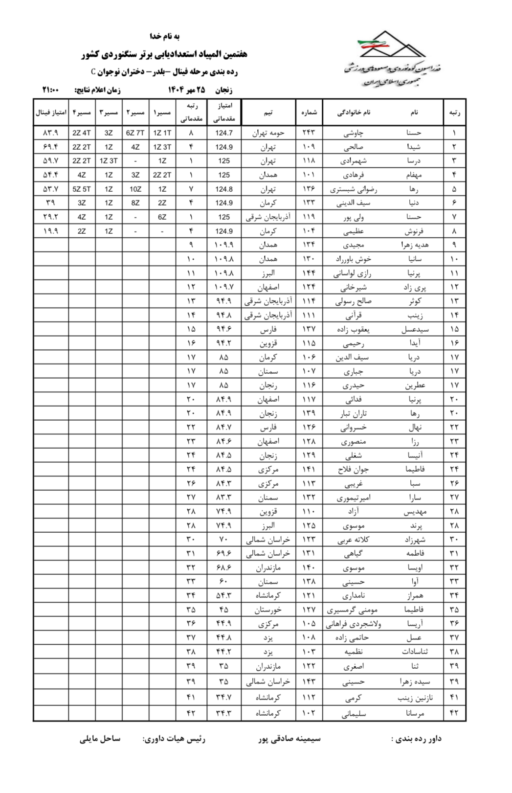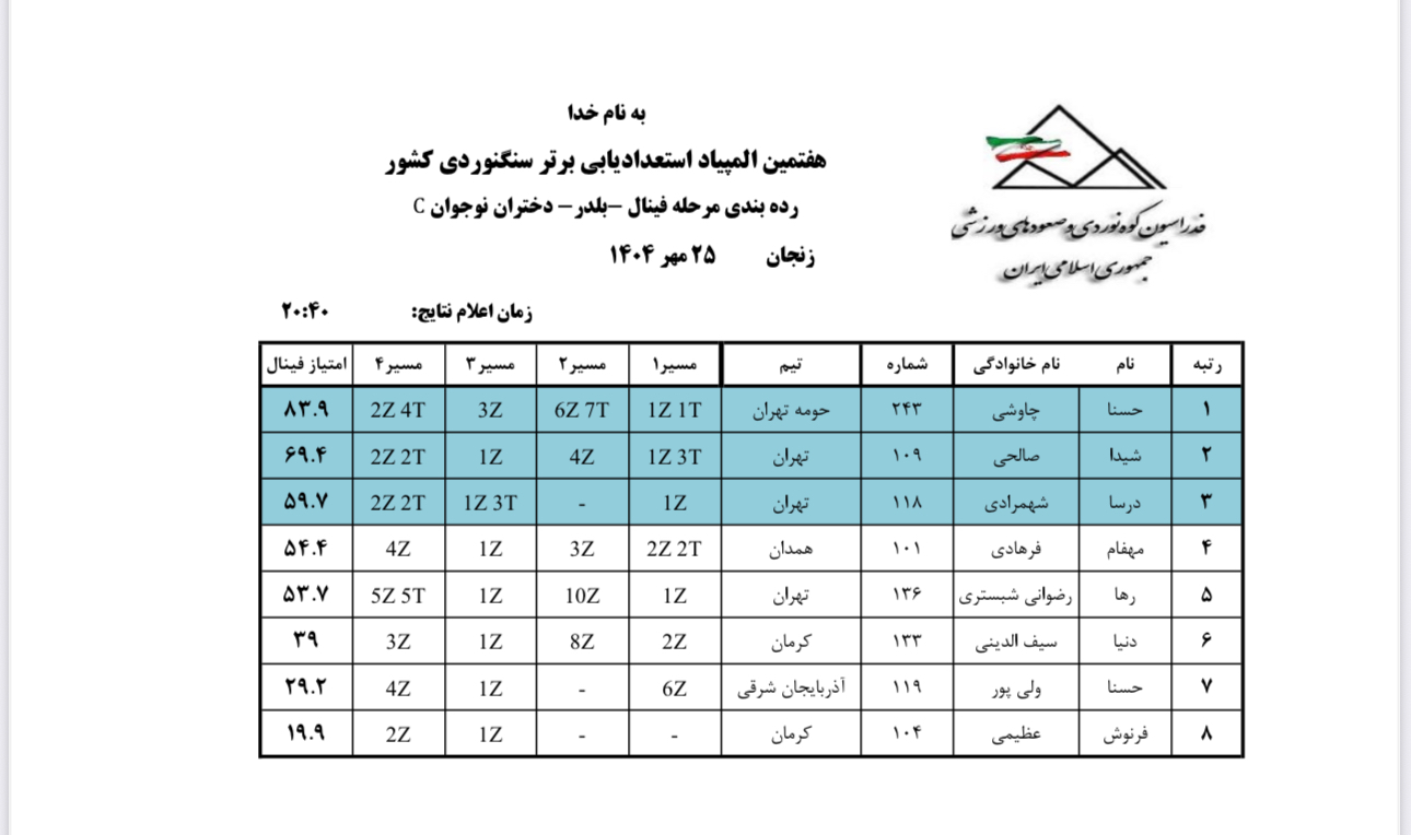 نتایج هفتمین دوره مسابقات سنگنوردی المپیاد استعدادهای برتر کشور در زنجان