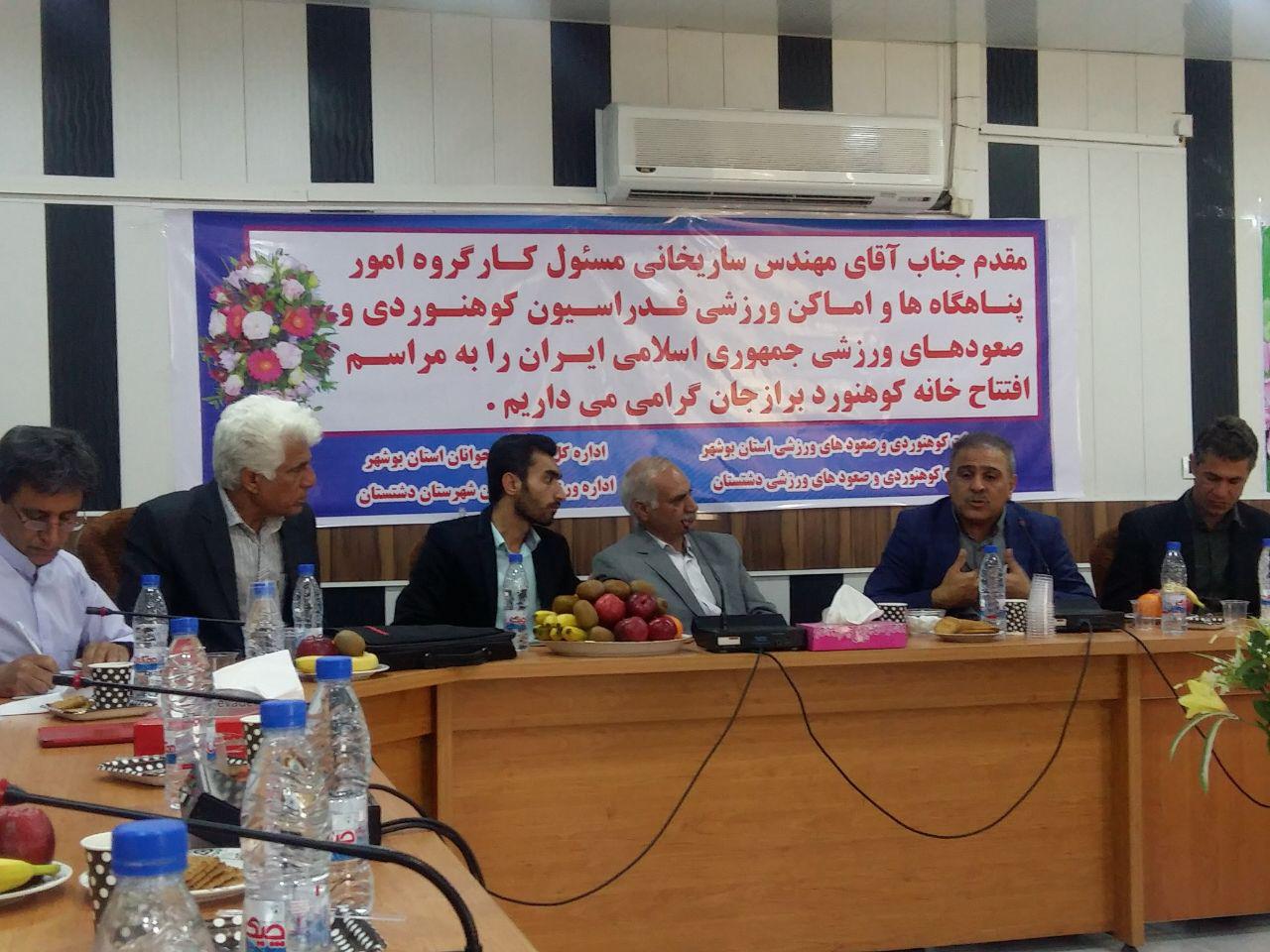 امروز بیست و چهارم اسفندماه 96 با حضور مهندس ساریخانی مسئول کارگروه امور پناهگاهها و اماکن ورزشی فدراسیون کوهنوردی و صعودهای ورزشی کشور ، سید محسن موسوی رییس هیات کوهنوردی و صعودهای ورزشی استان بوشهر ، محمدحسین زاهدی فرد کارشناس اداره ورزش و جوانان شهرستان دشتستان ، اقدسی رییس هیات کوهنوردی و صعودهای ورزشی شهرستان دشتستان ، روسای هیات های کوهنوردی و صعودهای ورزشی شهرستانهای استان بوشهر، مسئولین کارگروه های هیات و تعدادی از پیشکسوتان و کوهنوردان و سنگنوردان استان بوشهر و شهرستان دشتستان خانه کوهنورد برازجان افتتاح گردید . پس از آن آخرین جلسه هیات استان در سال 96 در سالن کنفرانس خانه کوهنورد برازجان برگزار گردید و پس از سخنان آقایان موسوی و ساریخانی ، روسای هیاتها به ارائه نظرات و دیدگاههای خود در خصوص مشکلات و درخواستهای  هیاتهای حوزه فعالیت خود پرداختند . در این خصوص آقایان زاهدی فرد و اقدسی ضمن تشکر و تقدیر از  کمارج حاجی رییس اداره ورزش و جوانان شهرستان دشتستان ، موسوی رییس هیات استان و مهندس ساریخانی و فدراسیون به خاطر حمایتهای بی دریغ و همه جانبه از کوهنوردی و صعودهای ورزشی شهرستان دشتستان تقاضای تجهیز  اولین و تنها سالن سنگنوردی اختصاصی و خانه کوهنورد در استان بوشهر را نمودند .