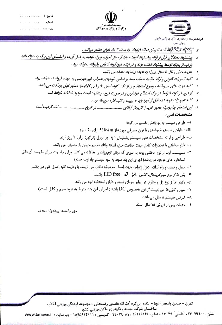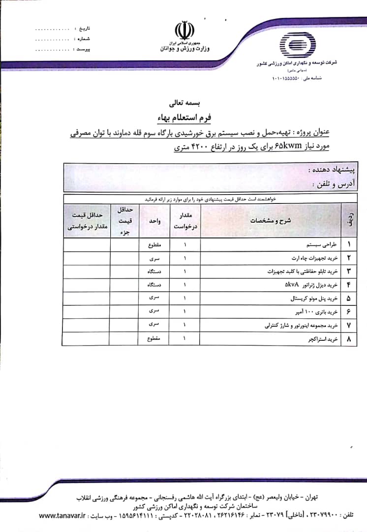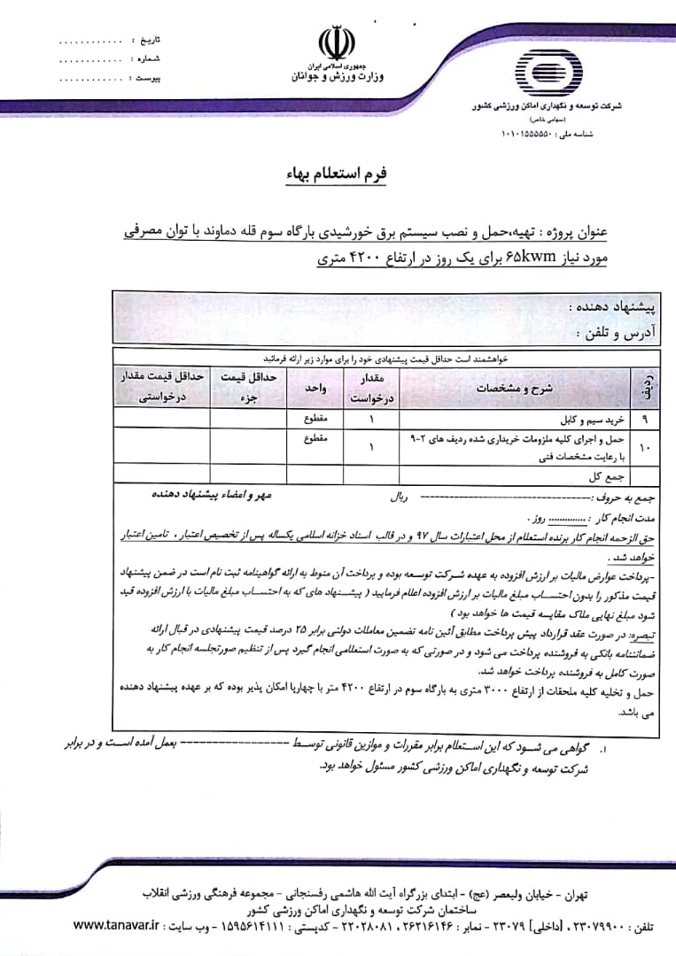 به اطلاع میرساند؛ فدراسیون کوهنوردی و صعودهای ورزشی، بنا دارد جهت خرید و نصب «برق خورشیدی» در بارگاه سوم از طریق استعلام شرکت توسعه و نگهداری اماکن ورزشی کشور اقدام نماید. متقاضیان میتوانند با مراجعه به سایت ستاد setadiran.ir (سامانه تدارکات الکترونیک دولت) نسبت به پرکردن برگهای استعلام اقدام کنند. لازم به توضیح است؛ جهت دریافت استعلام فوق، به ساختمان وزارت صنعت، معدن و تجارت، به آدرس: بلوار کشاورز، جنب ساختمان شهید نادری مراجعه نموده و امضای الکترونیک ثبت نمایند. فایلهای پیوست را ملاحظه نمائید: