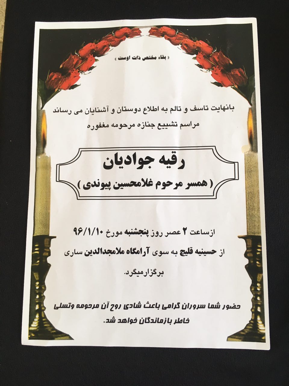با نهايت تاسف و تأثر مطلع شديم والده جناب آقاي "دكتر محمد تقي پيوندي" پزشك تيم ملي اميد كوه نوردي به رحمت خدا رفته اند. ضمن عرض تسليت به ايشان و خانواده محترم، از خداوند متعال براي آنمرحومه مغفوره علو درجات را مسئلت داريم. تصوير اطلاعيه مراسم :