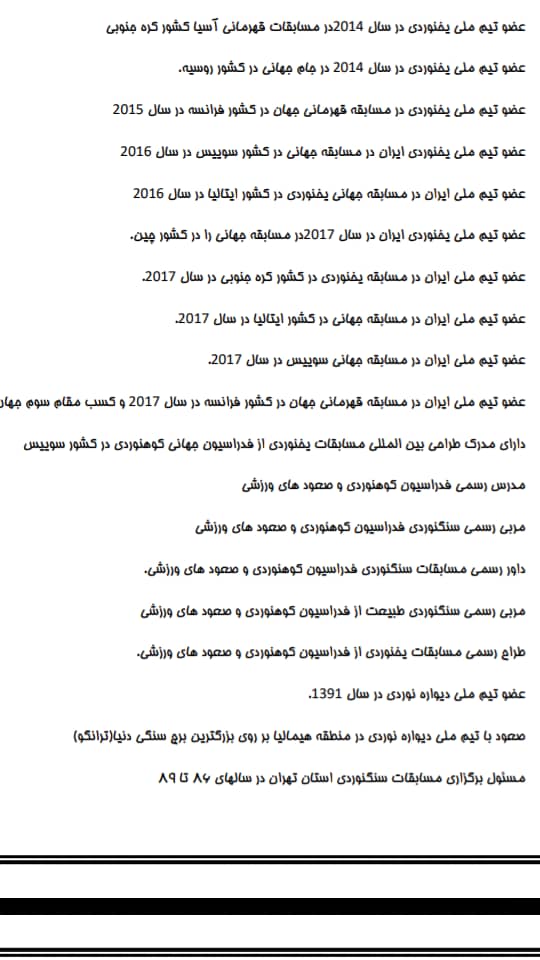 وی سابقه عضویت در تیم ملی یخنوردی در مسابقات قهرمانی جهان ٢٠١٧ را که تیم ایران به عنوان سوم تیمی دست یافت، دارد.