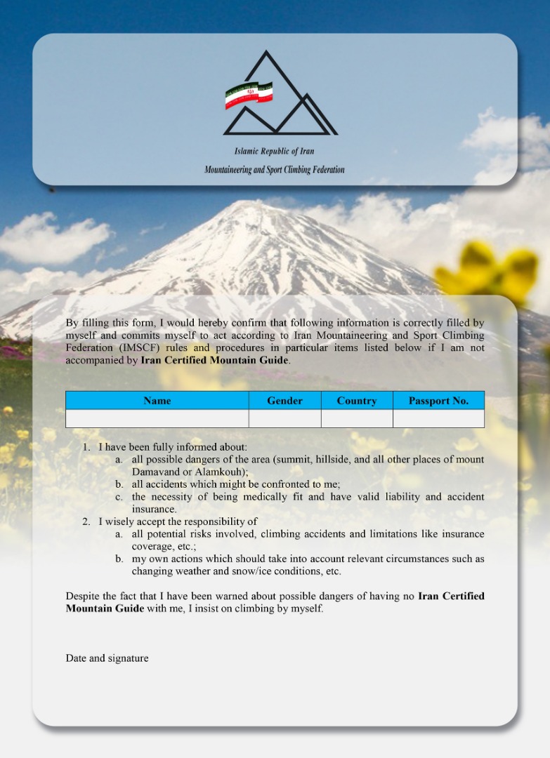 این تعهدنامه، گردشگرانی که از راهنمایان کوهستان رسمی استفاده نمی کنند ضمن توجیه