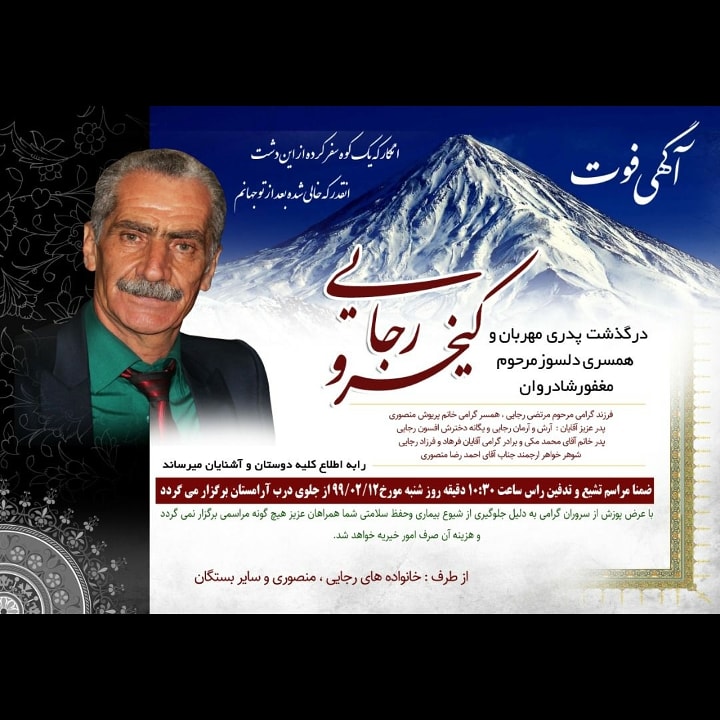 با تأسف و تأثر فراوان با خبر شدیم که راهنمای کوهستان استان مرکزی و مربی و پیشکسوت کوهنوردی جناب آقای «خسرو رجایی» بر اثر بیماری دار فانی را وداع گفت.