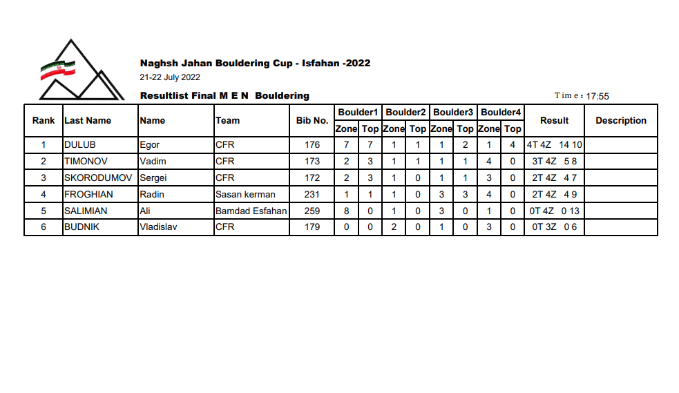 نتایج دومین دوره مسابقات سنگنوردی جام کشوری «نقش جهان» / ماده «بولدرینگ» / بخش خانمها