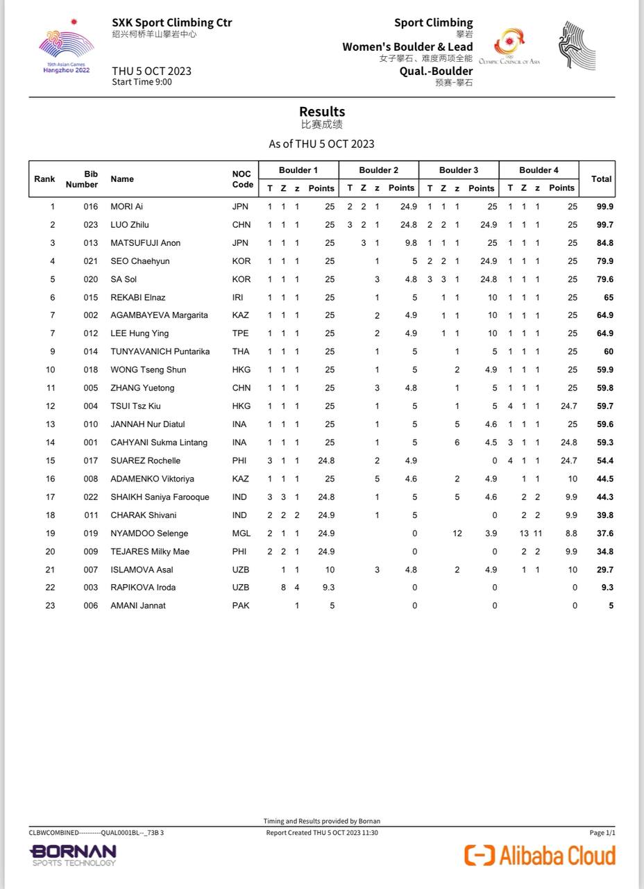 در جدول مقدماتی ماده بولدرینگ و لید زنان، آی موری از ژاپن با ۱۹۶ امتیاز، چیهیون سئو از کره با ۱۷۶ امتیاز و ژیلو لو از چین با ۱۷۵.۵ امتیاز اول تا سوم شدند.