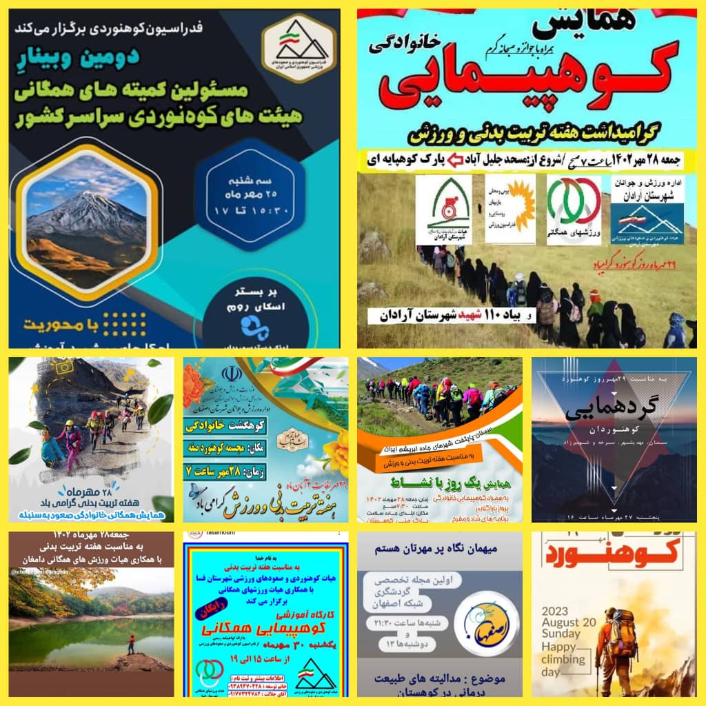 به گزارش کمیته همگانی فدراسیون کوهنوردی و صعودهای ورزشی؛ با رویکرد و تاکید بر «آموزش، همایش و پیمایش» برای عموم مردم در مهر ماه سال ۱۴۰۲ و به مناسبت هفته تربیت بدنی و ورزش، برنامههای مختلفی به شرح ذیل توسط هیئتهای مختلف سراسر کشور برگزار شد؛