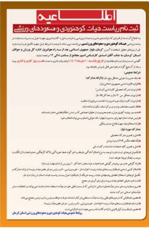 اطلاعیه انتخابات رئیس هیئت کوهنوردی و صعودهای ورزشی استان «کرمان»