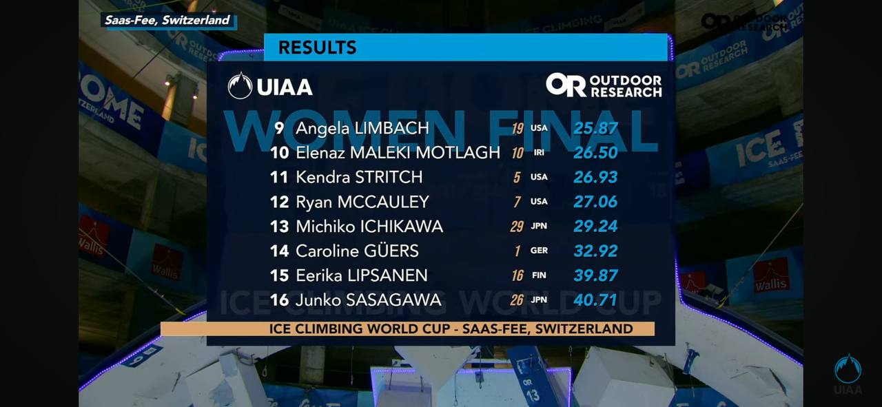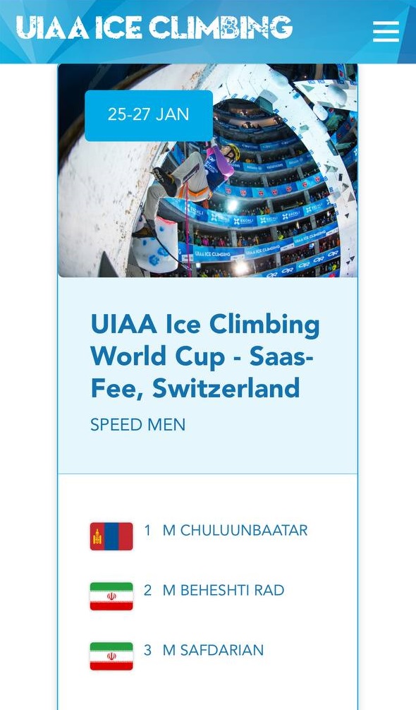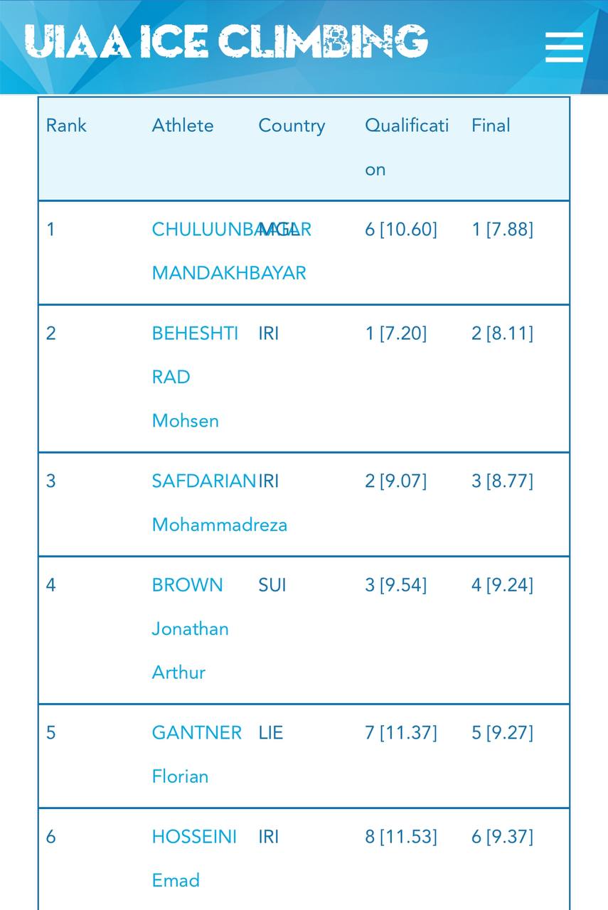 در این بخش دیگر یخنوردان کشورمان «عماد حسینی» رتبه ششم، «مجتبی هاشمی» رتبه سیزدهم، «بهزاد پیرمرادیان» رتبه پانزدهم و «شاهین نادری» رتبه هجدم را کسب کردند.
