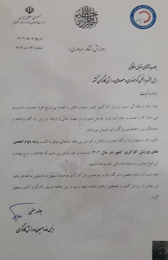 براساس اعلام فدراسیون کارگری و طی مکتوبی، این انجمن براساس ارزیابی کمیته فنی فدراسیون کارگری، در میان بیش از ۳۰ انجمن فعال، حائز رتبه دوم شد.