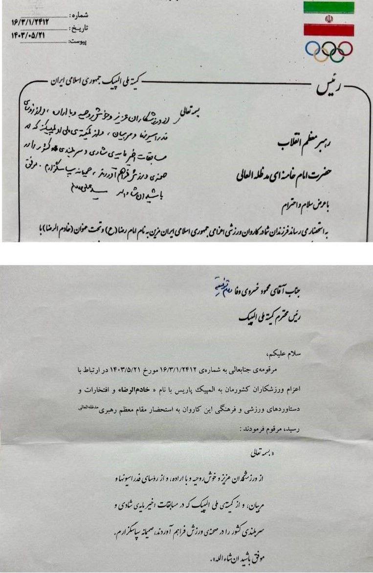 تصویر دستخط رهبر معظم انقلاب در تقدیر از افتخارآفرینان جمهوری اسلامی ایران در المپیک ۲۰۲۴ پاریس را در ادامه ملاحظه نمائید: ...