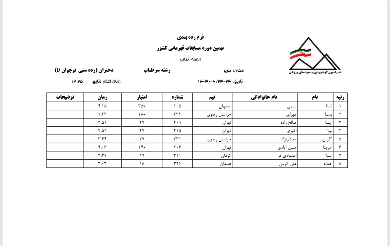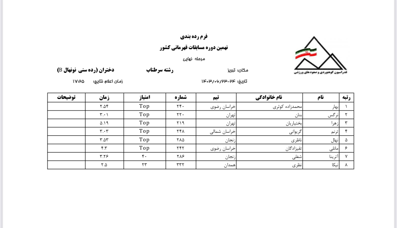 ◀️نتایج مواد و ردههای سنی مختلف / بخش دختران: