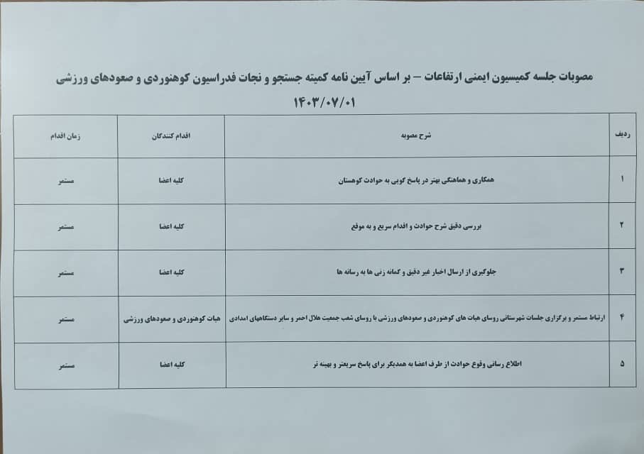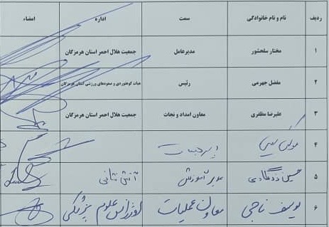 بنا به درخواست فدراسیون کوهنوردی و صعودهای ورزشی مبنی بر تشکیل جلسه پیشگیری از حوادث خصوصا در فصل زمستان با ارگانهای ذیربط، یکشنبه یکم مهرماه در محل دفتر مدیر عامل هلال احمر استان هرمزگان، با حضور «سلحشور» مدیرعامل و نمایندگان سازمان آتش نشانی، اورژانس، ستاد بحران و رئیس و دبیر هیئت کوهنوردی استان تشکیل و موارد لازم مورد بحث و تبادل نظر قرار گرفت.