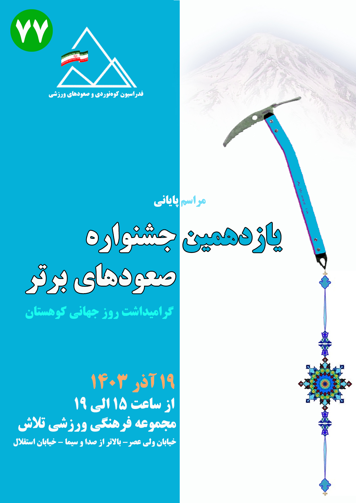 بنا بر اعلام دبیرخانه «یازدهمین جشنواره صعودهای برتر»، زمان آئین اختتامیه این جشنواره، از ساعت ۱۵ الی ۱۹ روز دوشنبه ۱۹ آذر ماه ۱۴۰۳ در آستانهی «روز جهانی کوهستان» برگزار خواهد شد.
