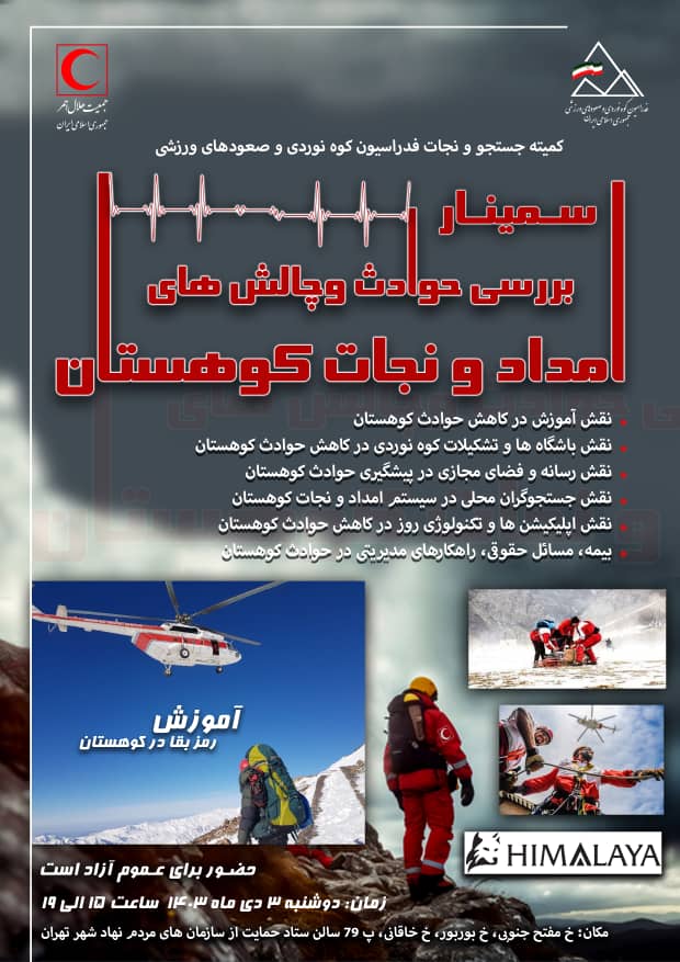 در این راستا از اساتید، مربیان، صاحب نظران، کارشناسان حوزه امداد و نجات، رسانهها و کوهنوردان دعوت مینماید تا ضمن ارسال مقالات خود به آقای علی عسگری روزبهانی نایب رییس کمیته جستجو و نجات فدراسیون کوهنوردی و صعودهای ورزشی به شماره تلگرام 09339773443 ، در این همایش حضور بهم رسانند.