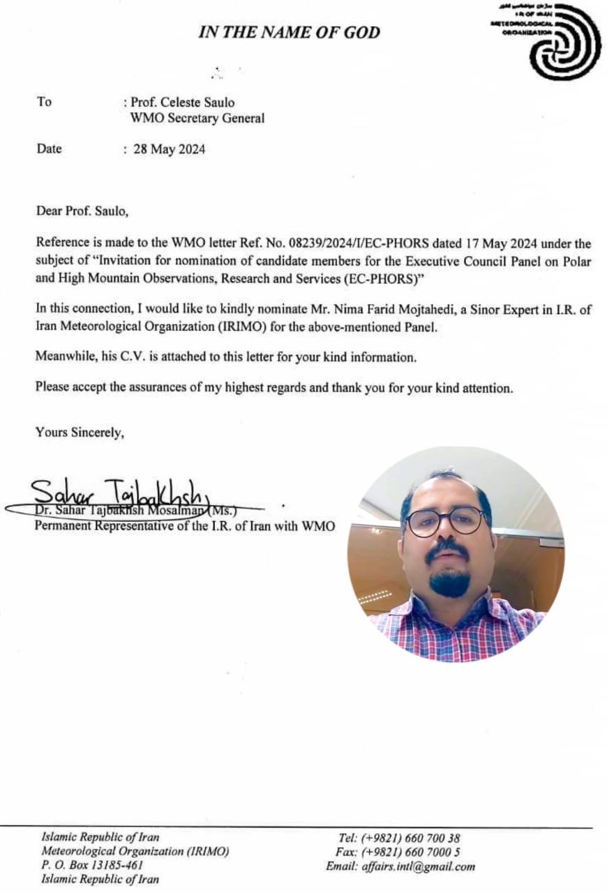 دكتر «نيما فريد مجتهدی»؛ دبیر بخش هواشناسی کوهستان و دبیر کمیته تحقیق و پژوهش فدراسیون کوهنوردی و صعودهای ورزشی، بهعنوان نماينده رسمي سازمان هواشناسي ايران در پنل كوهستان سازمان جهاني هواشناسی انتخاب شد.