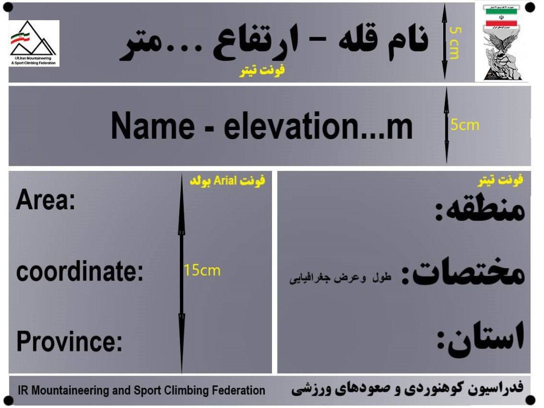 همچنین هیئتهای کوهنوردی و صعودهای ورزشی استان میتوانند با هماهنگی کمیته حفظ محیط کوهستان فدراسیون، از الگوی یکسان نصب تابلوی قلل (برطبق فایل و توضیحات پیوست) که دارای آثار تخریبی و آلودگی بصری کمتری است استفاده نمایند.