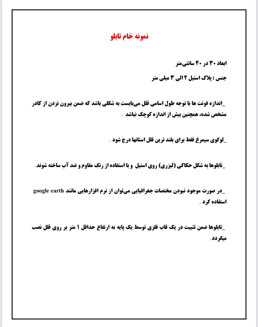 شایان ذکر است در تهیه این تابلوها سعی شده است ضمن ساده و جامع بودن اطلاعات، از مواد مستحکم و مقاوم در برابر فرسایش استفاده گردد.