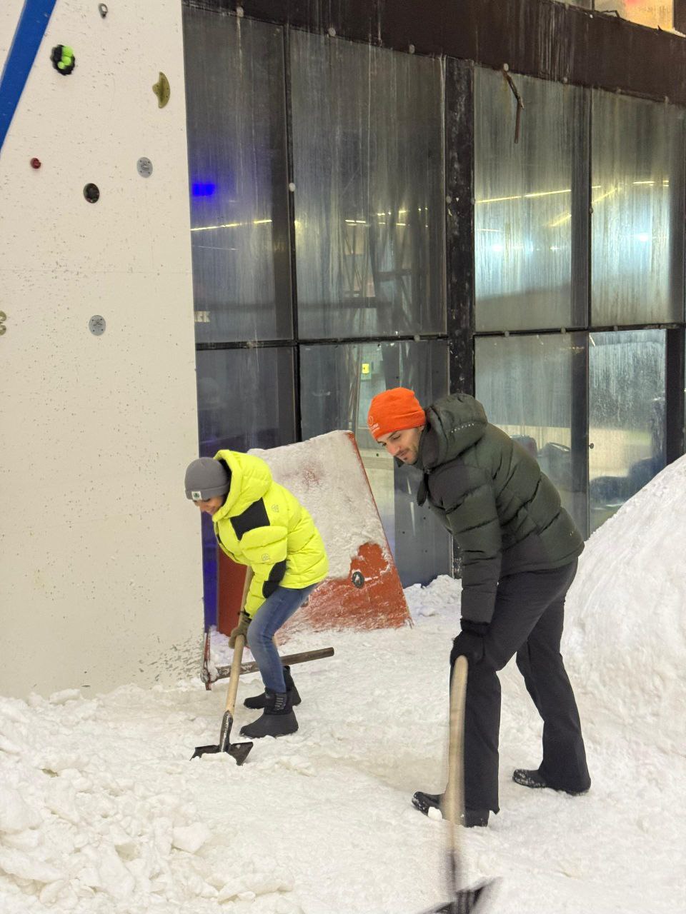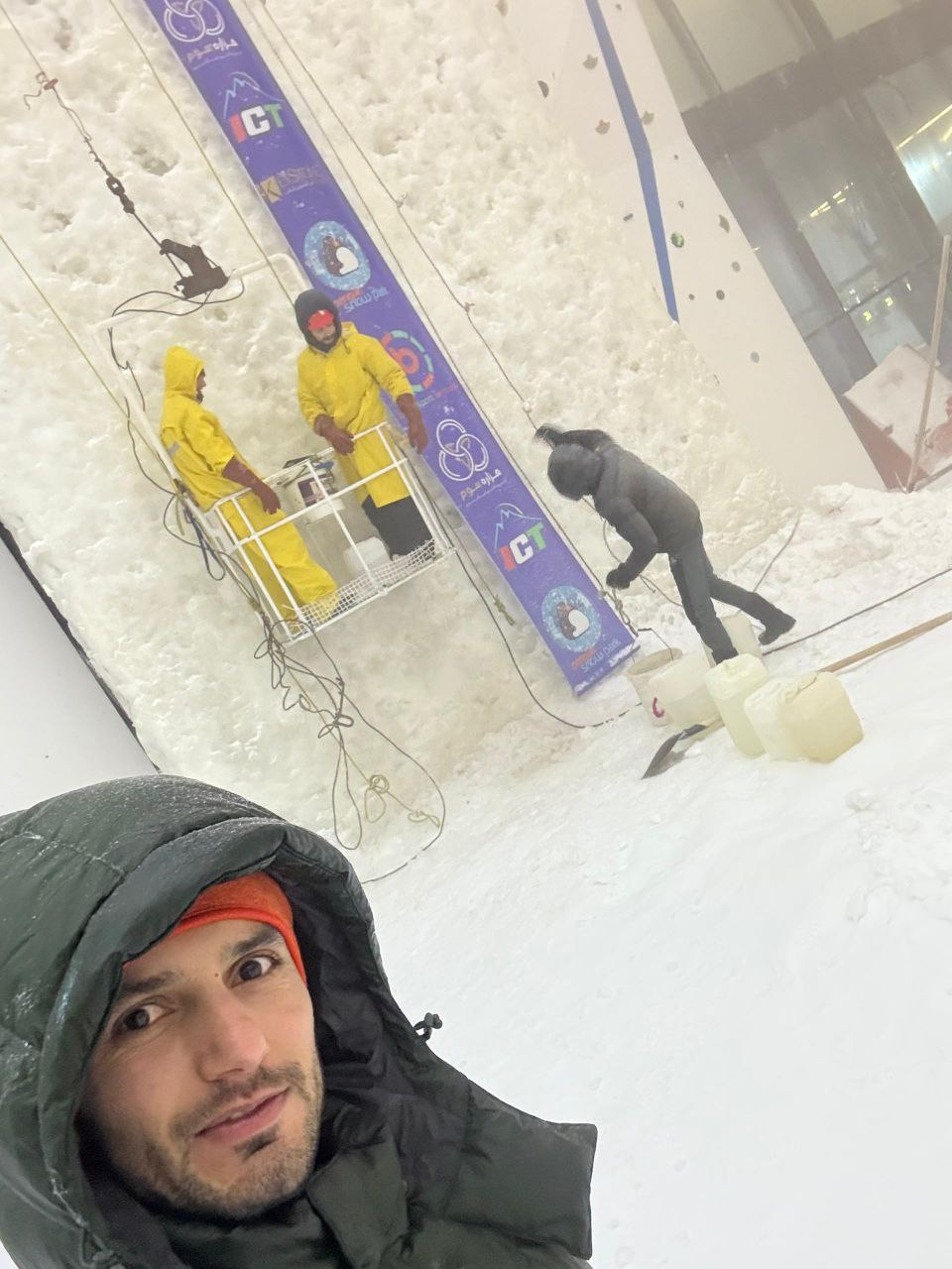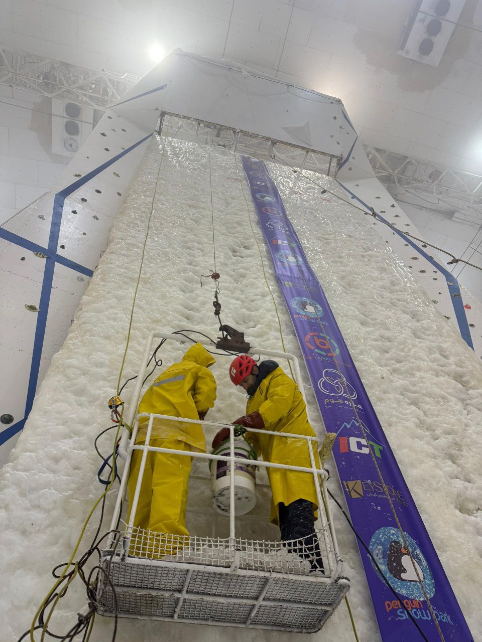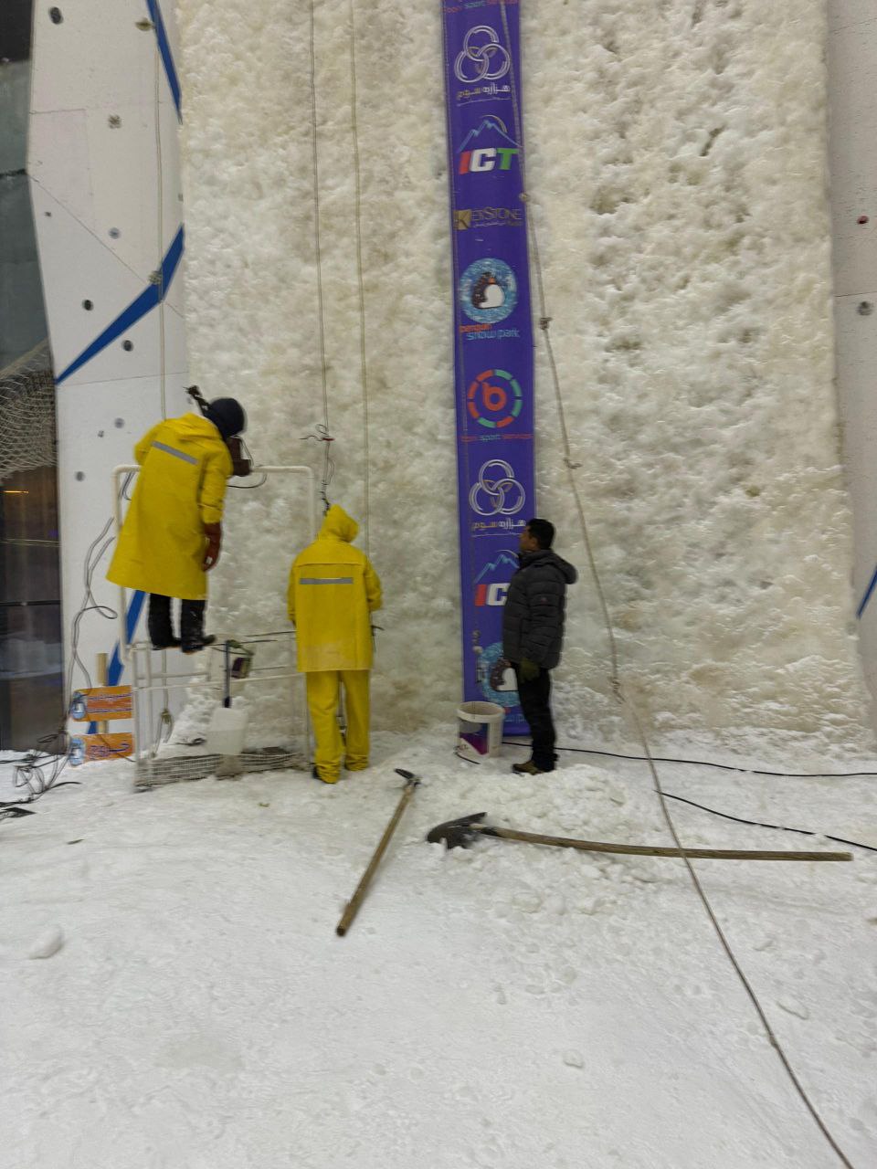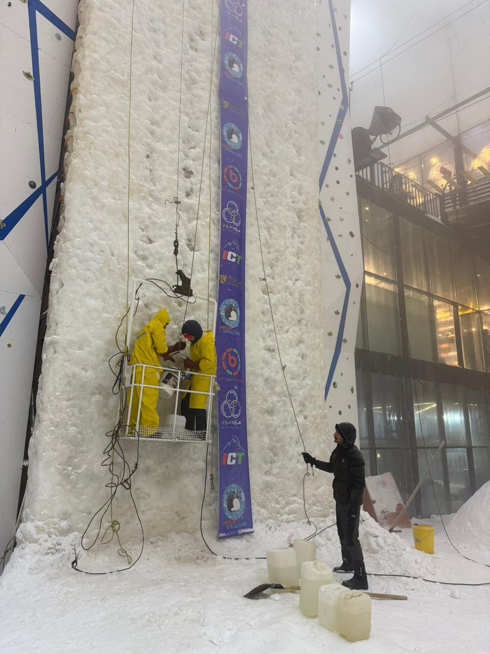 پس از انجام تمرینات فشرده و مستمر بر روی دیواره یخی سرعت، به دلیل تخریب یخهای سطحی دیواره، ترمیم آن توسط اعضای تیم ملی یخنوردی برای شروع دوباره تمرینات صورت پذیرفت.