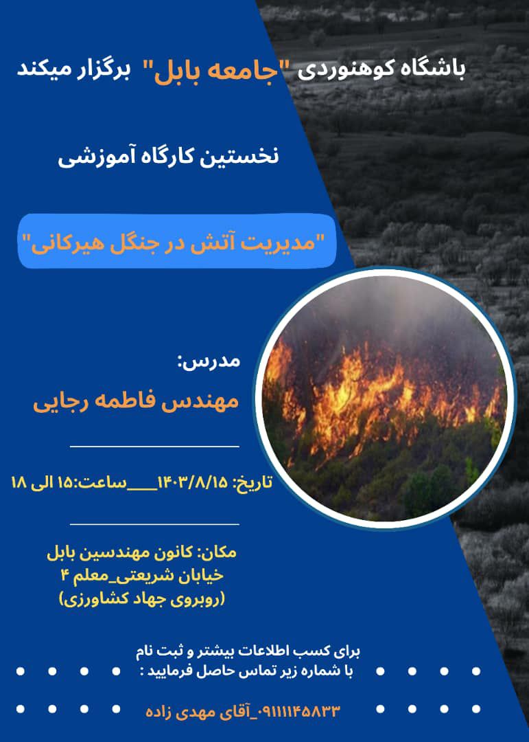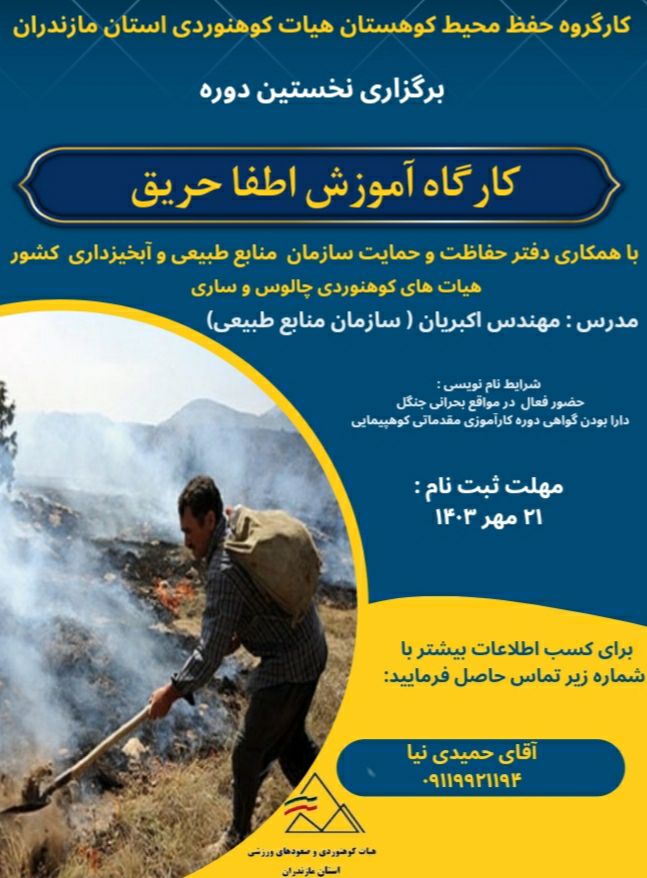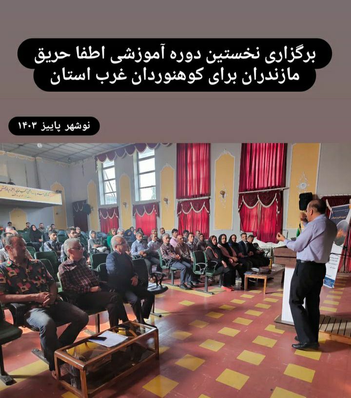 ۴-برگزاری چندین کارگاه آموزشی "مدیریت آتش درهیرکانی" در شهرستانهای نوشهر، ساری، بابل با تدریس جناب مهندس اکبریان از سازمان منابع طبیعی کشور و سرکار خانم مهندس رجایی مسئول کمیته حفظ محیط کوهستان استان مازندران