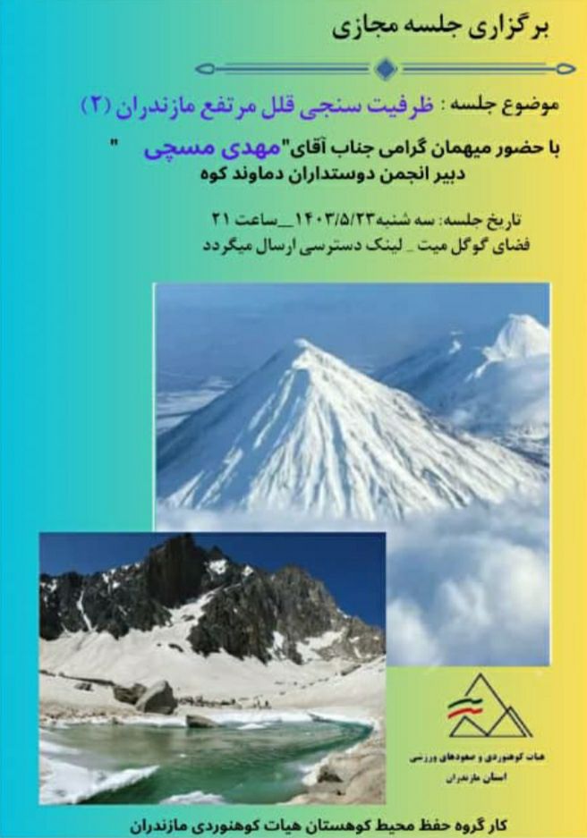 ۳-برگزاری دو جلسه مجازی با موضوعیت "ظرفیت سنجی قلل مرتفع مازندران دماوند" با حضور دبیر انجمن دوستداران دماوند کوه جناب مهدی مسچی