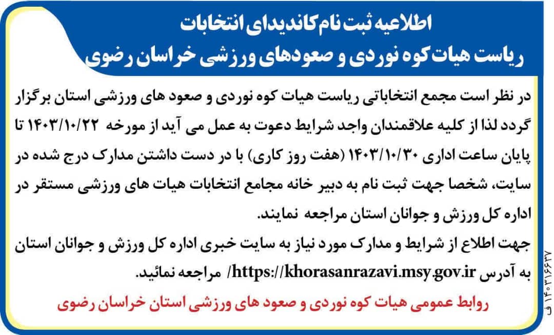 اطلاعیه ثبتنام کاندیدای انتخابات رئیس هیئت کوهنوردی وصعودهای ورزشی استان خراسان رضوی