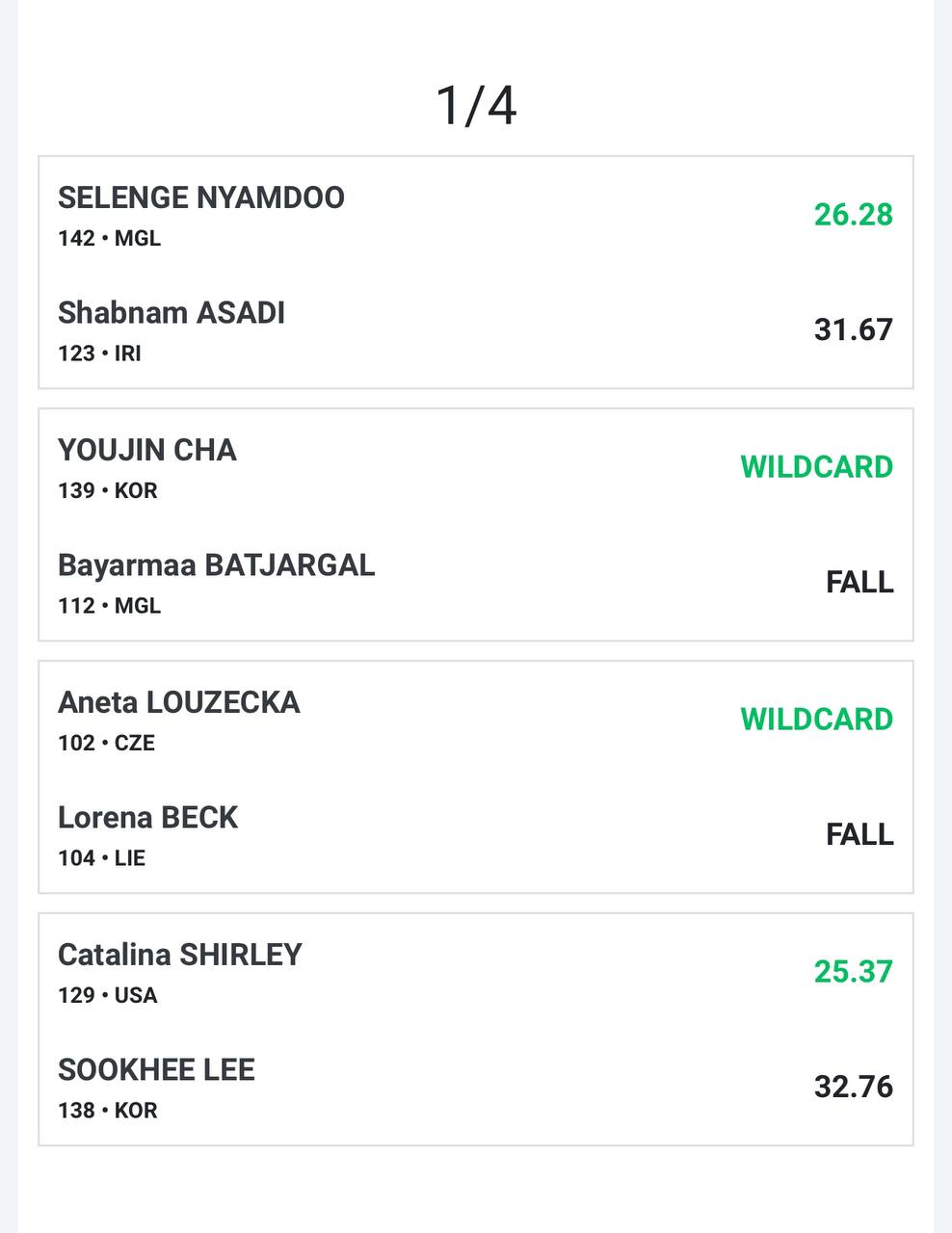 هم چنین «شبنم اسدی» در ماده «سرعت» بخش زنان پس از شکست مقابل «نیامدو» از مغولستان از راه یابی به مرحله نیمه نهائی بازماند و رتبه پنجم جام جهانی را کسب کرد. شایان ذکر است؛ «نیامدو» مغولستانی در این ماده قهرمان شد. نمایندگان آمریکا، کره جنوبی و چک، به ترتیب دوم تا چهارم شدند.