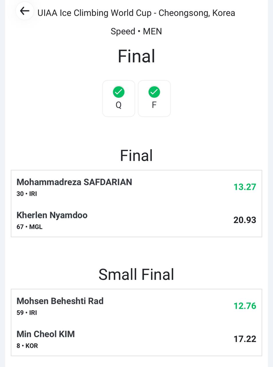 بنا بر این گزارش؛ در ماده «سرعت» جام جهانی و در بخش مردان، «محمد رضا صفدریان» موفق به کسب عنوان قهرمانی جام جهانی شد. «محسن بهشتی» نیز در این ماده در جایگاه سوم قرار گرفت. در این بخش نماینده مغولستان دوم و نماینده کره جنوبی چهارم شدند.