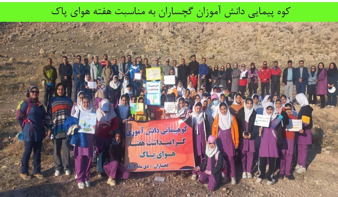 ۳-کوهپیمایی دانش آموزان گچسارانی به مناسبت هفته ملی هوای پاک با همکاری اداره محیط زیست و هیئت کوهنوردی و صعودهای ورزشی شهرستان در راستای فرهنگ سازی و ترویج رشته ورزشی کوهنوردی در تاریخ اول بهمن ماه