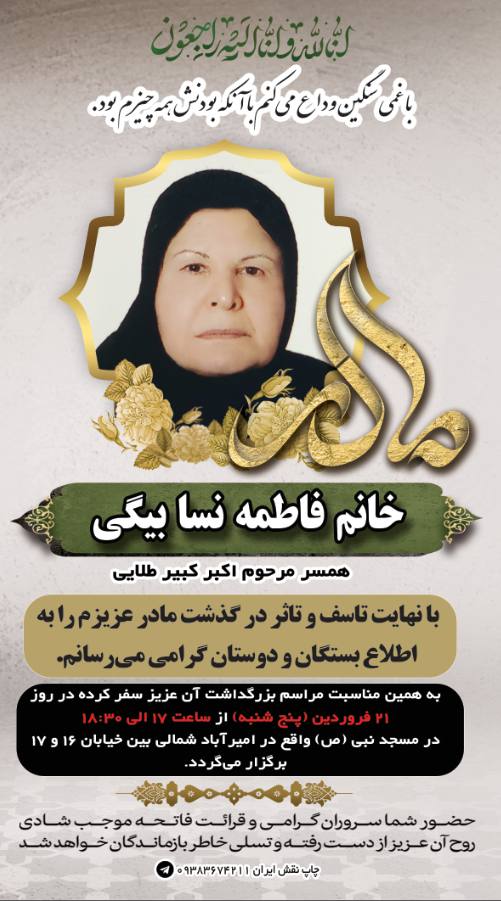 در کمال تأسف و تأثر مطلع شدیم؛ جناب آقای «مهرداد طلایی» از مربیان ارجمند فدراسیون، در غم فقدان مادر گرانقدر خود عزادار هستند. ضمن عرض تسلیت به ایشان و خانواده محترمشان، از خداوند متعال برای آنمرحومه مغفوره علو درجات و برای بازماندگان صبر جمیل و اجر جزیل مسئلت داریم.