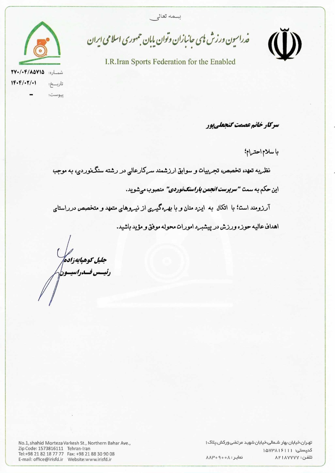 شایان ذکر است؛ طی حکمی از سوی «کوهپایه زاده»، «عصمت گنجعلیپور» به عنوان «سرپرست انجمن پاراسنگنوردی» منصوب شد.