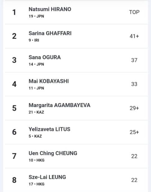 در پایان، نماینده ایران با نمایشی تحسینبرانگیز پس از سنگنورد ژاپنی در جایگاه دوم ایستاد و مدال نقره را به دست آورد. مقام سوم نیز به ورزشکار دیگری از ژاپن رسید.