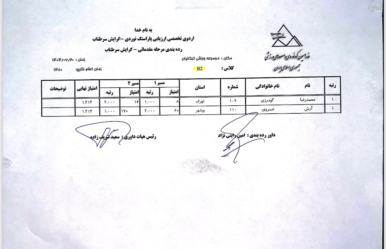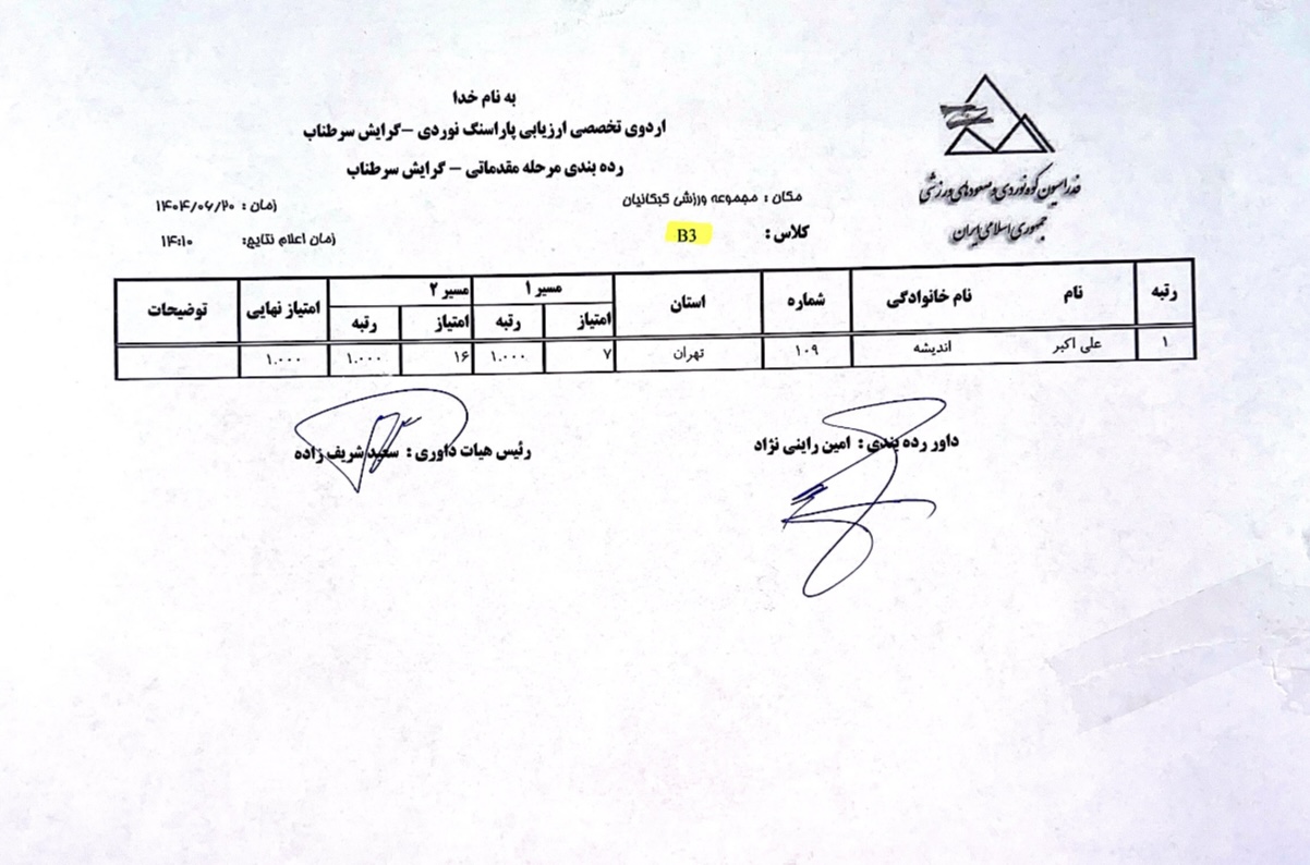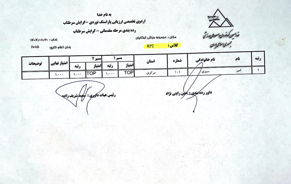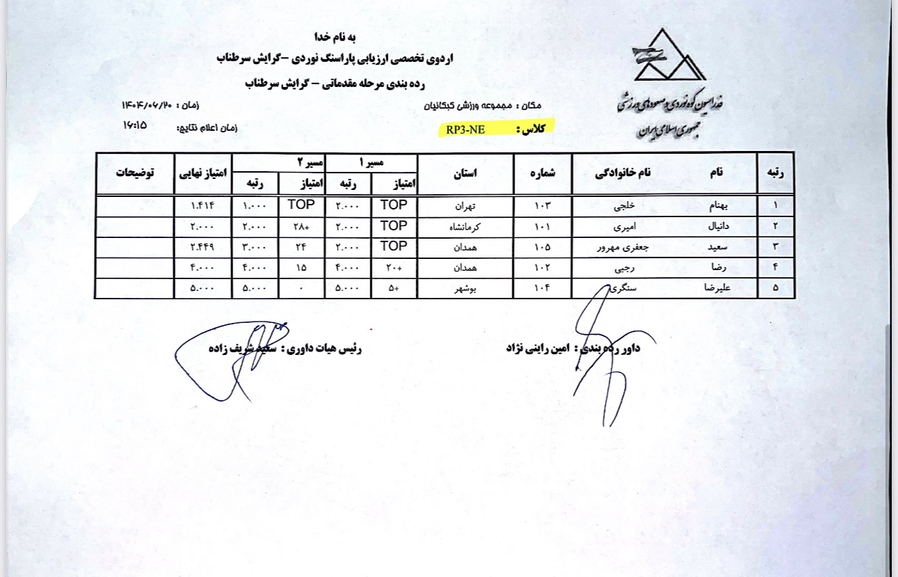 نتایج نخستین اردوی تخصصی ارزیابی پاراسنگنوردی آقایان / ۲۰ شهریور ۱۴۰۴ / مجموعه ورزشی کبکانیان
