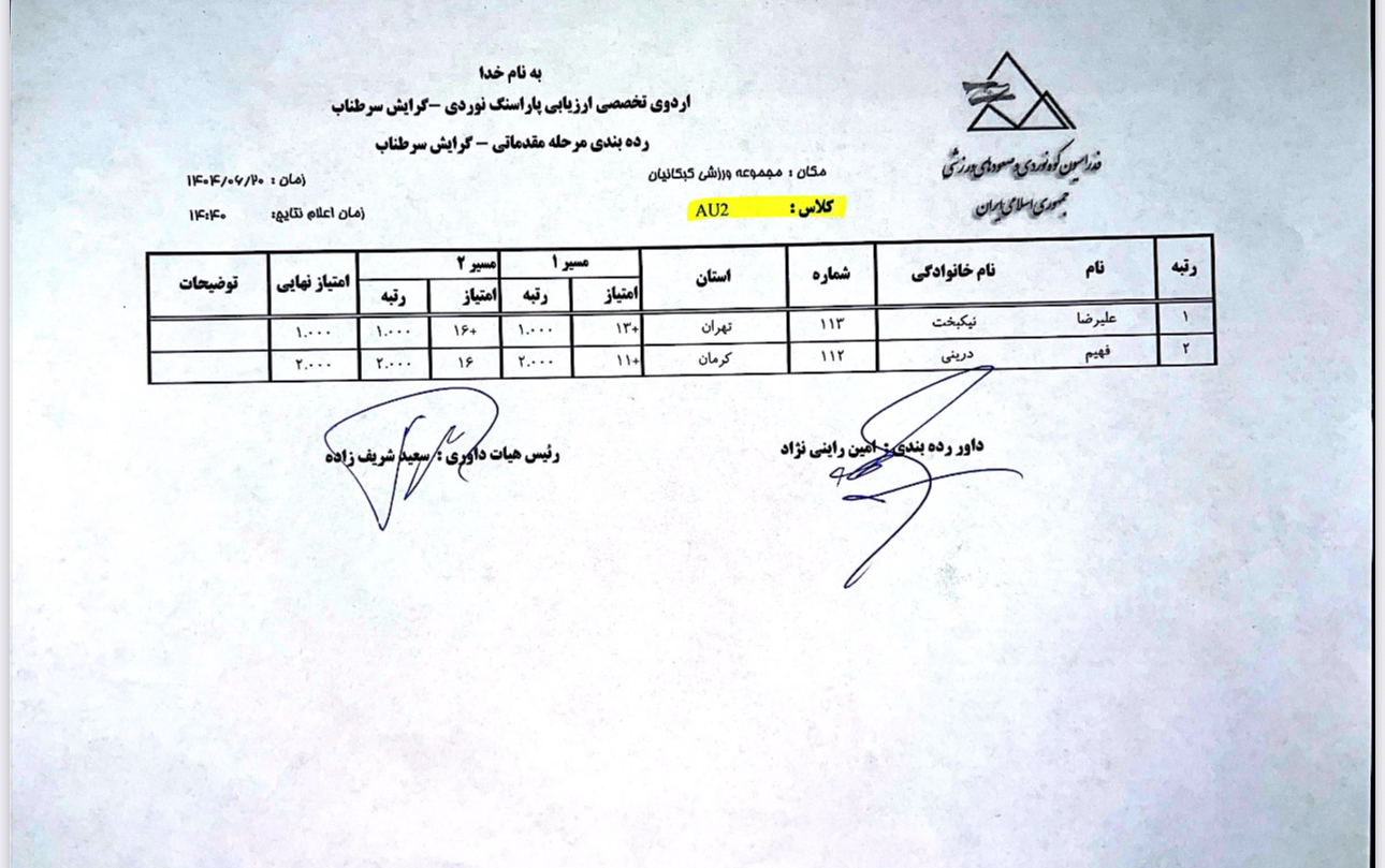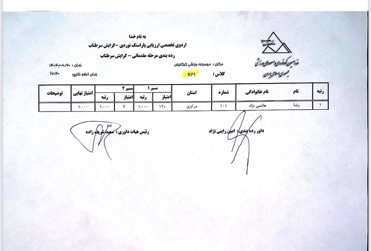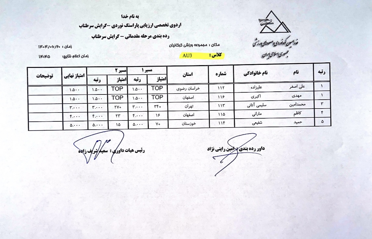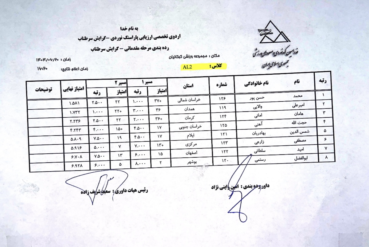 نتایج نخستین اردوی تخصصی ارزیابی پاراسنگنوردی آقایان / ۲۰ شهریور ۱۴۰۴ / مجموعه ورزشی کبکانیان