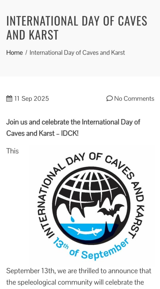 به پیشنهاد اتحادیه جهانی غارشناسی (UIS)، روز ۱۳ سپتامبر بهطور رسمی با تصویب یونسکو در تقویم جهانی به عنوان روز جهانی غارها و کارست (International Day of Caves and Karst – IDCK) ثبت شد...
