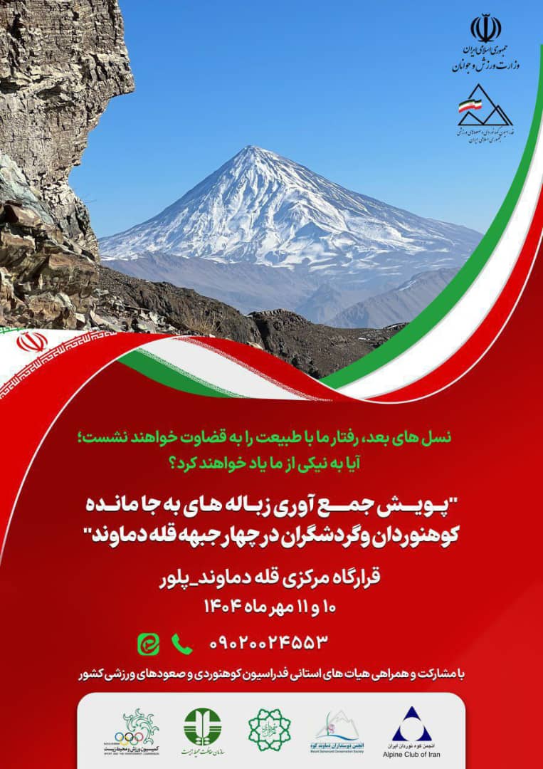 به آگاهی میرساند؛ پیرو برنامهریزی و اطلاعرسانی فدراسیون و در راستای عمل به مسئولیتهای اجتماعی جامعه کوهنوردی کشور در پاسداشت محیط زیست، "پویش ملی جمعآوری زبالههای بهجا مانده کوهنوردان و گردشگران در چهار جبهه قله دماوند" در روزهای 10 و 11 مهرماه 1404 از قرارگاه مرکزی قله دماوند (پلور) برگزار میگردد.