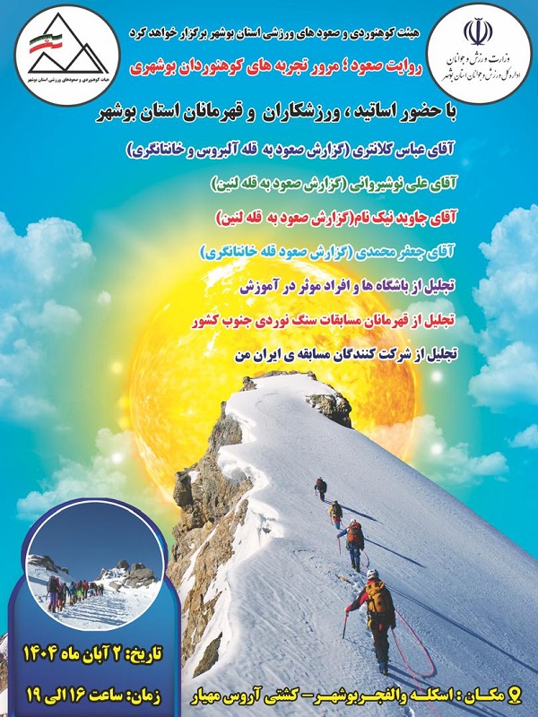 به همت هیئت کوهنوردی و صعودهای ورزشی استان بوشهر، برنامهی «روایت صعود» با حضور جمعی از اساتید، قهرمانان، فعالان و دوستداران این رشته در سالن کشتی آروس مهیار برگزار شد.