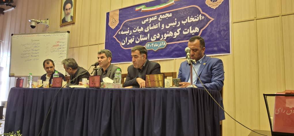 مجمع انتخاباتی هیئت کوهنوردی و صعودهای ورزشی استان تهران روز شنبه ۸ آذر ۱۴۰۴ با حضور «حسین مقدم» دبیر فدراسیون، «حمید آسیابان» مسئول امور مجامع فدراسیون، «دکتر علی جوادی» مدیرکل و معاون توسعه ورزش، کارشناسان ورزشی، نمایندگان مجامع، مسئولان حراست، بازرسی و روابط عمومی اداره کل ورزش و جوانان استان، نماینده وزارت ورزش، «آقای ملکی» سرپرست هیئت استان و سایر اعضای مجمع برگزار شد. این مجمع با دستور انتخاب رئیس هیئت و با حضور ۶ کاندیدا شامل آقایان: علی افشاری، کرمعلی ایرجی، بهنام بهلولی، امیر خوشخو و آرمین مجاهدپور تشکیل شد.