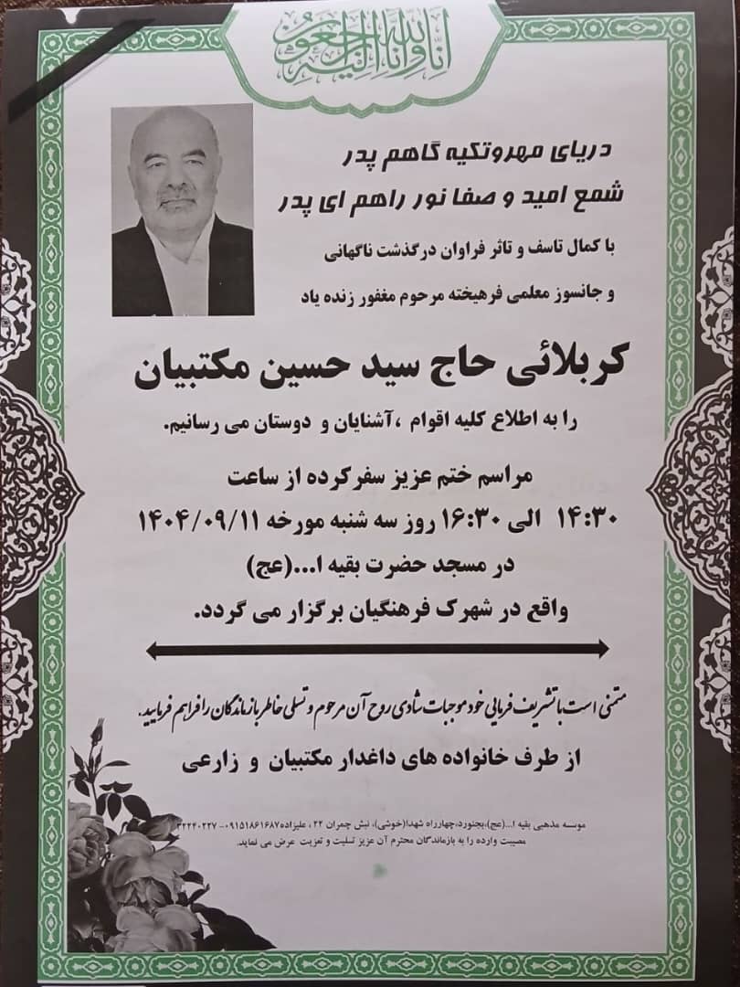 در کمال تأسف و تأثر باخبر شدیم «حاج سیدحسین مکتبیان» پدر ارجمند جناب «مکتبیان» مسئول کمیته صعودهای ورزشی هیئت استان خراسان شمالی، دار فانی را وداع گفت.