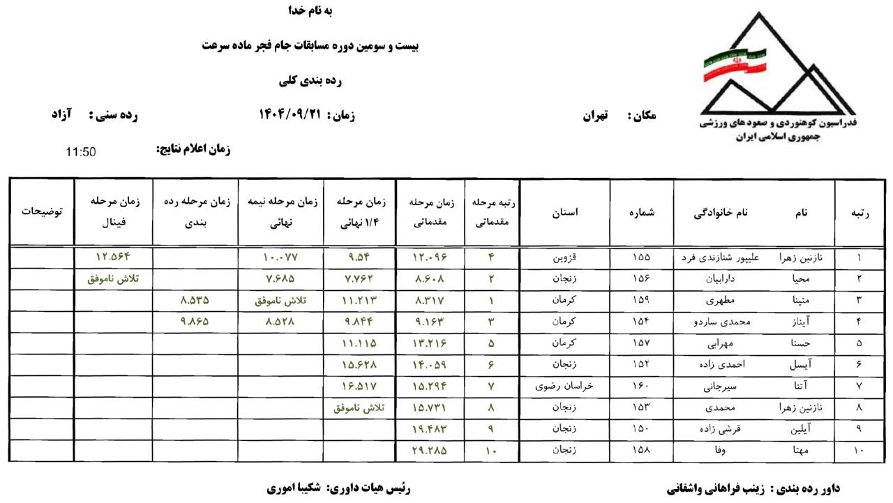 رقابتهای سنگنوردی ماده سرعت جام فجر از 20 و 21 آذر 1404 با حضور ۳۵ ورزشکار پسر و ۱۰ ورزشکار دختر از ۷ استان کشور در کمپ تیمهای ملی سنگنوردی سالن کبکانیان تهران برگزار شد.