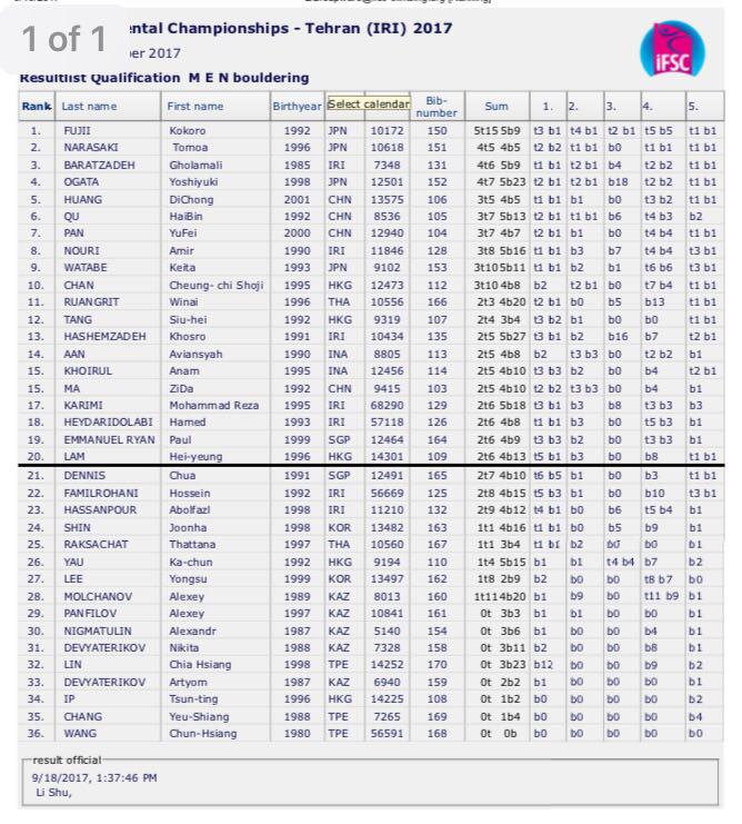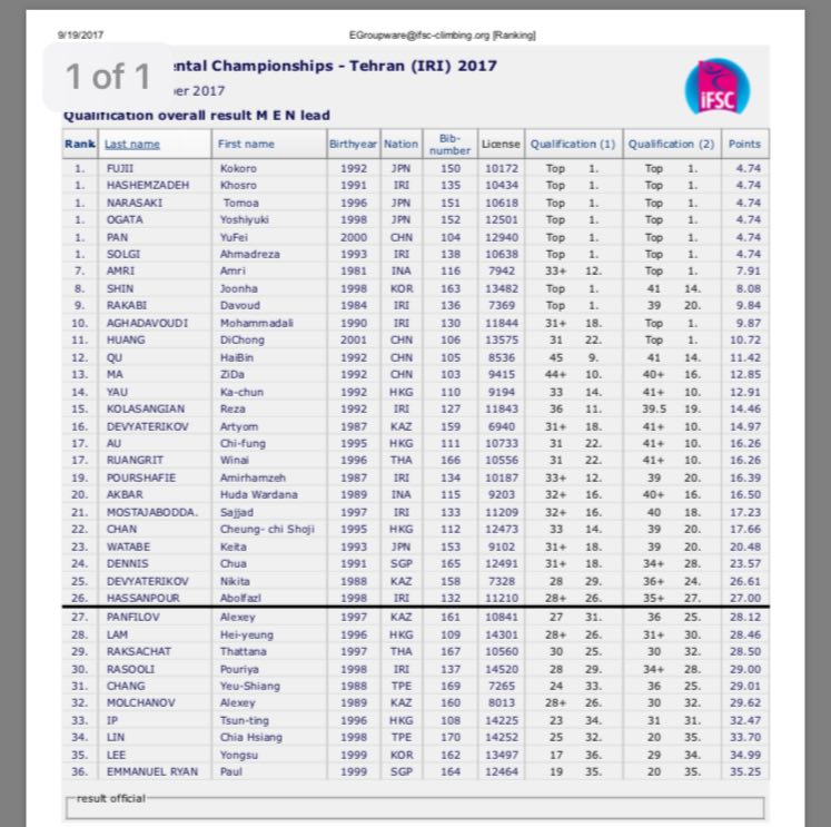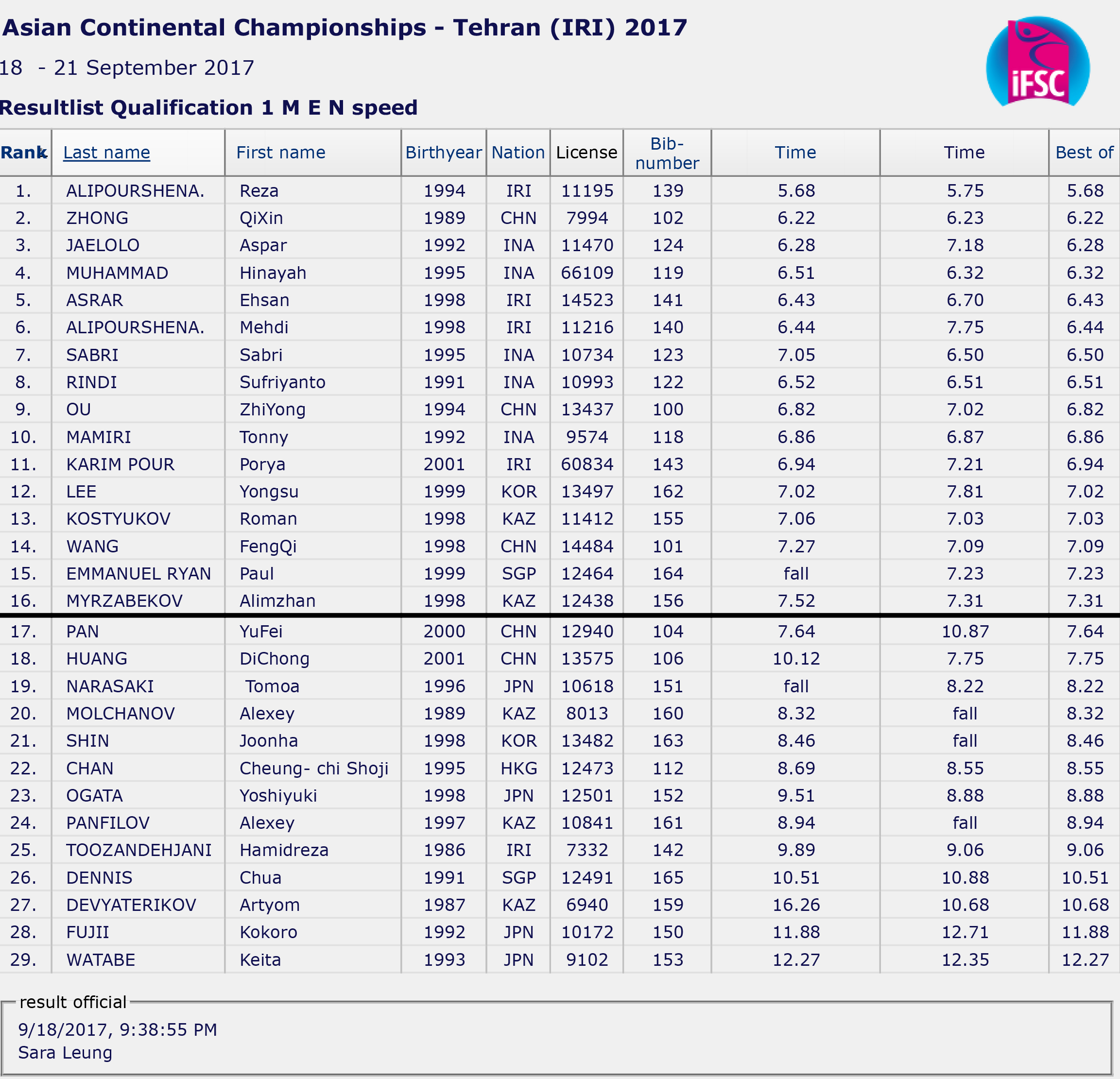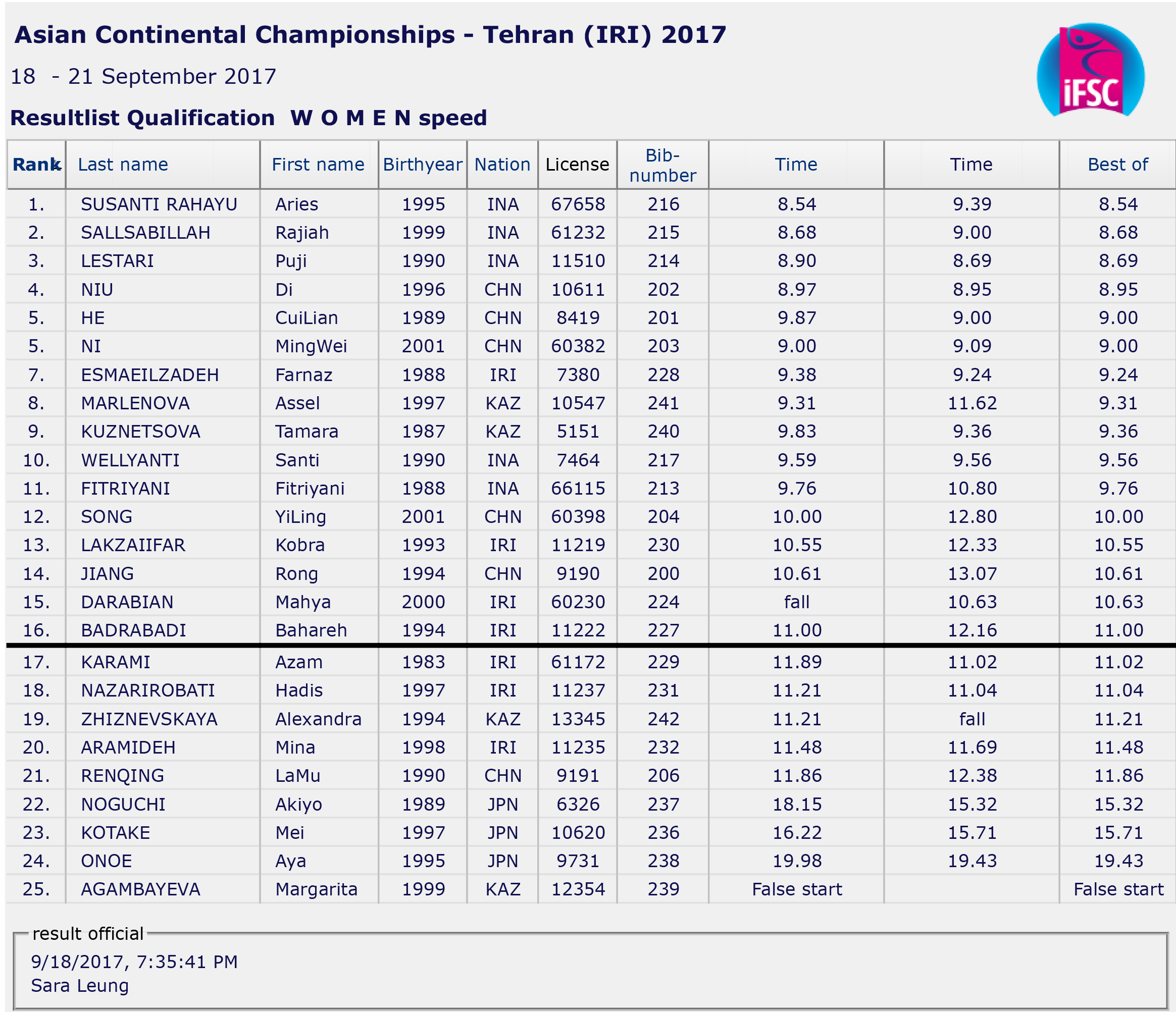 نتایج زنده بیست و پنجمین دوره رقابت های سنگ‌نوردی قهرمانی آسیا  را از طریق لینک ذیل دریافت و ملاحظه نمائید: