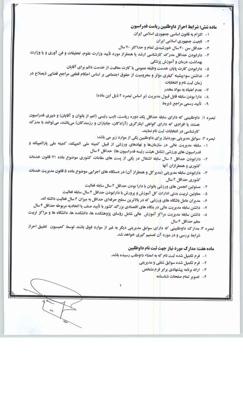در سال 1396، بدینوسیله از کلیه افراد واجد شرایط علاقمند به احراز پست ریاست فدراسیون
